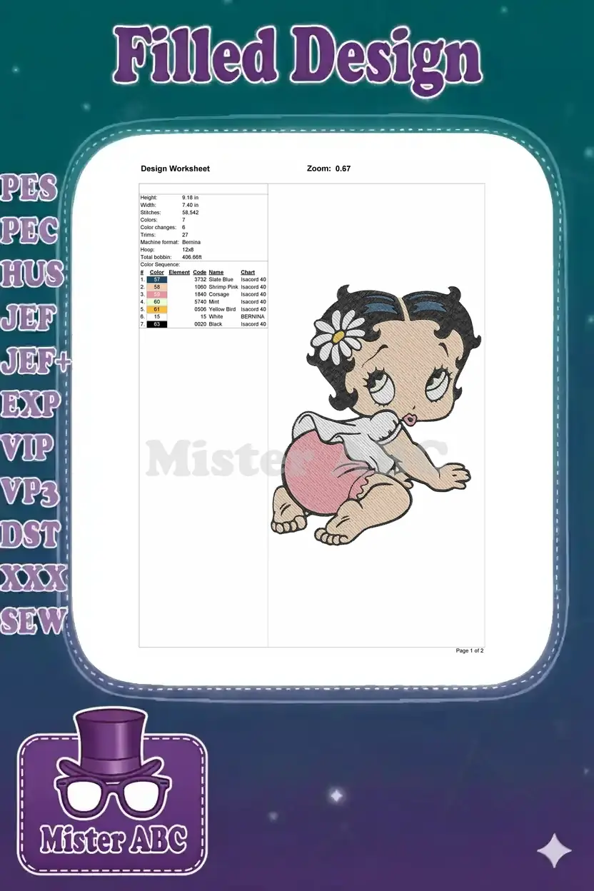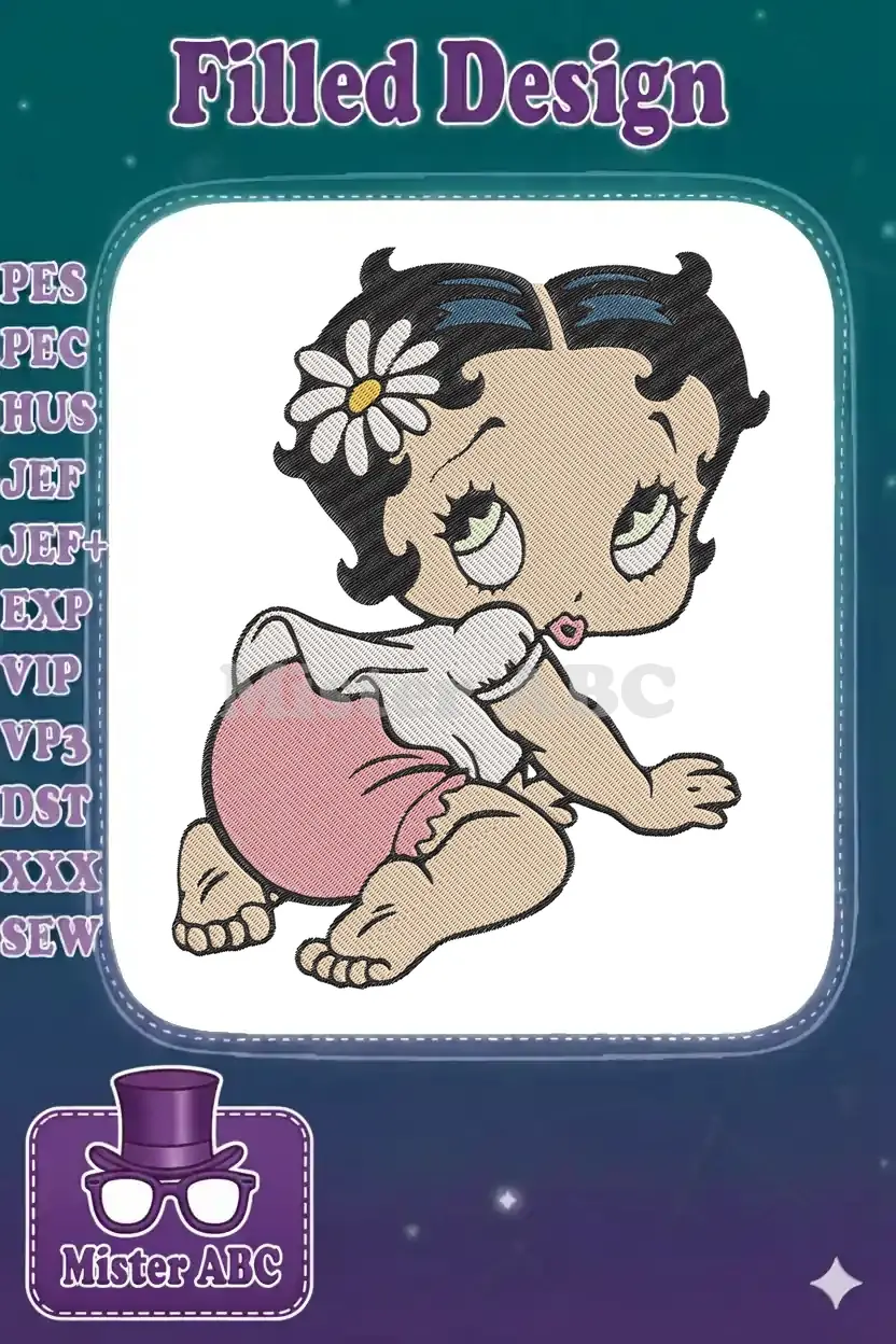 Adorable Baby Betty Boop crawling character embroidery designs with daisy