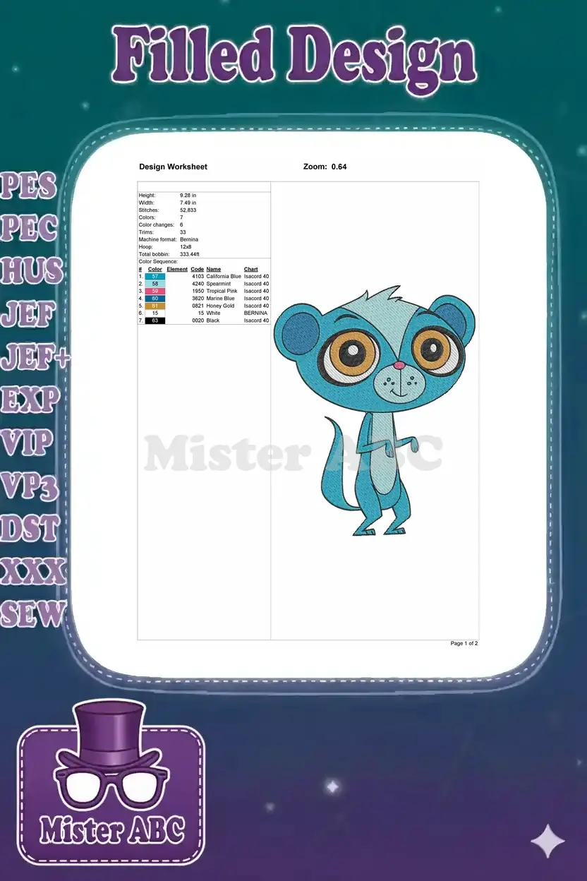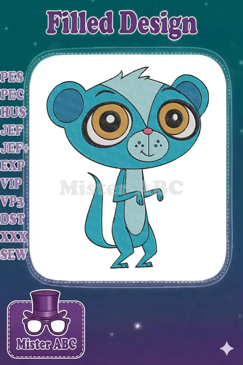 Adorable big-eyed blue ferret cartoon animal embroidery designs