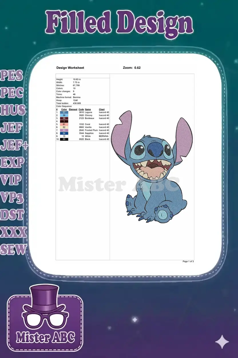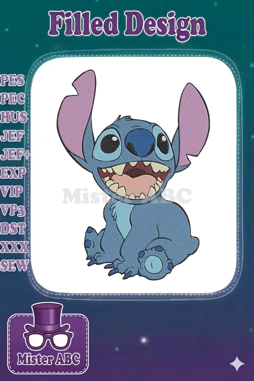 A vibrant embroidery design featuring Stitch from Lilo & Stitch, captured mid-laugh with intricate fill stitches. Perfect for adding playful charm to any project.