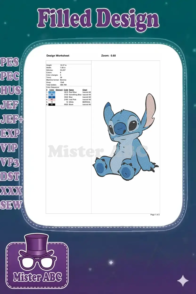 Embrace the playful spirit of Disney’s Stitch with this vibrant embroidery design, perfect for any fan’s creation.