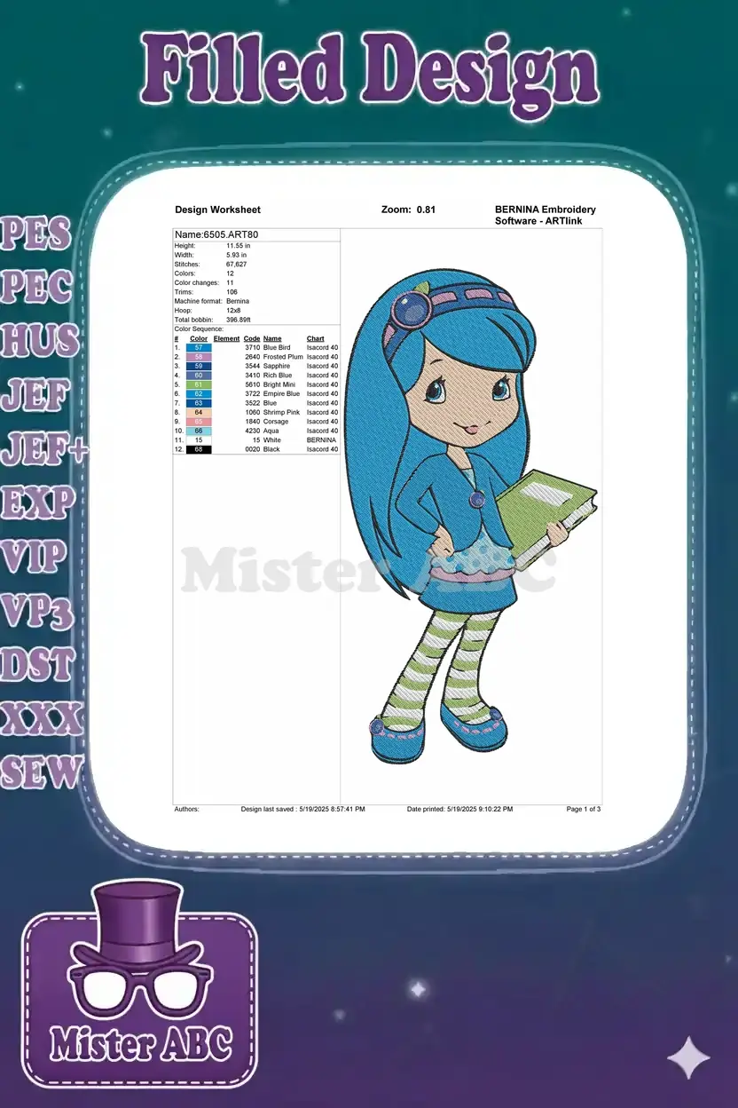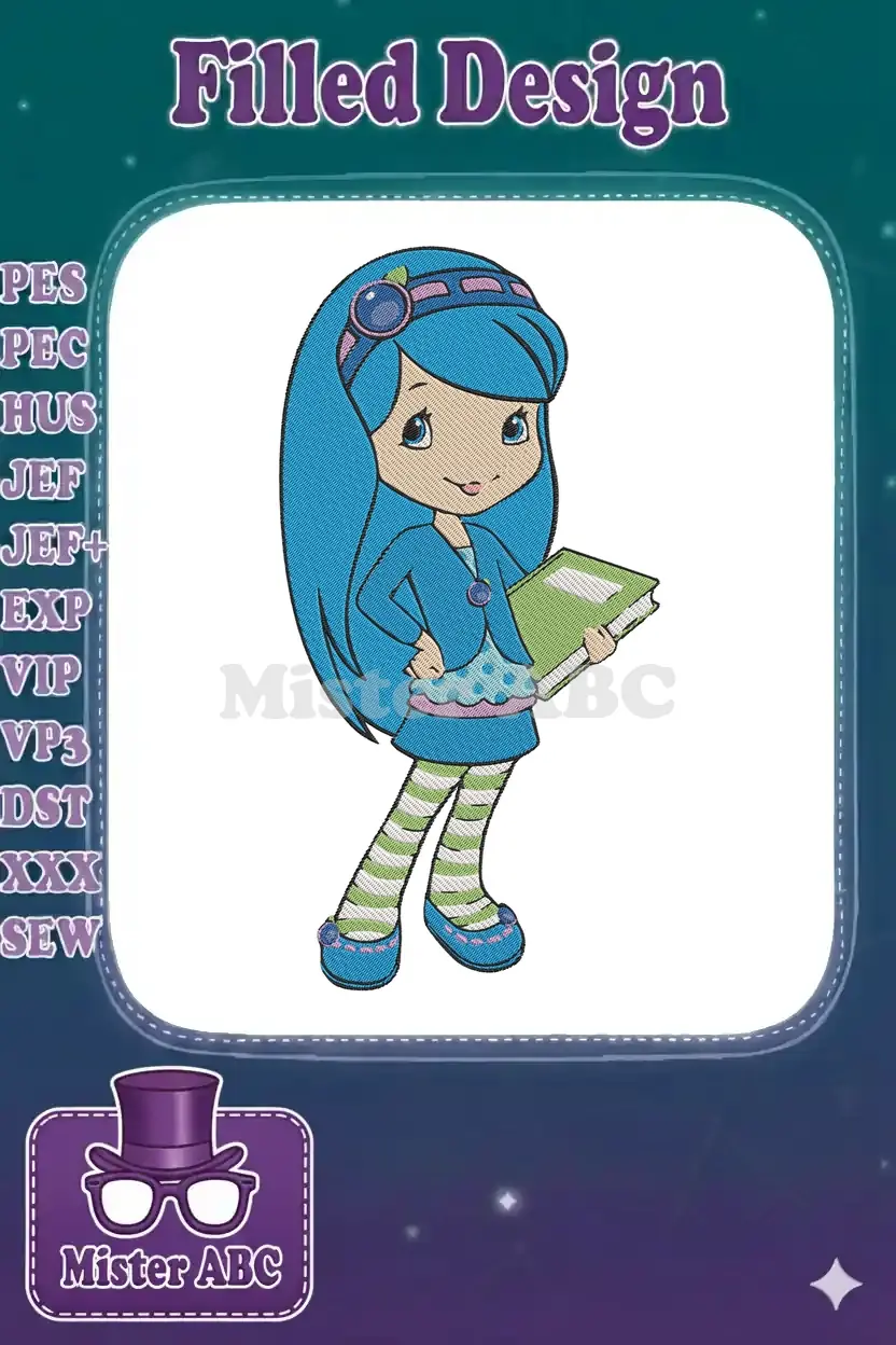 Adorable Blueberry Muffin student cartoon holding book embroidery designs