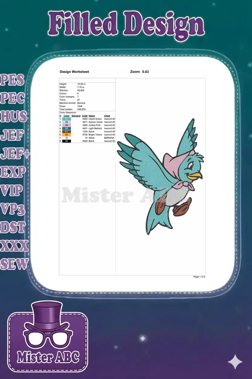 Adorable Cartoon Blue Bird with Pink Bow Flying Embroidery Designs