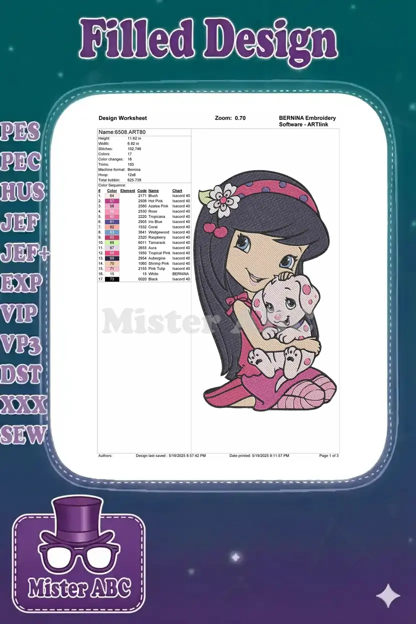 Adorable cartoon girl holding cute spotted puppy embroidery designs