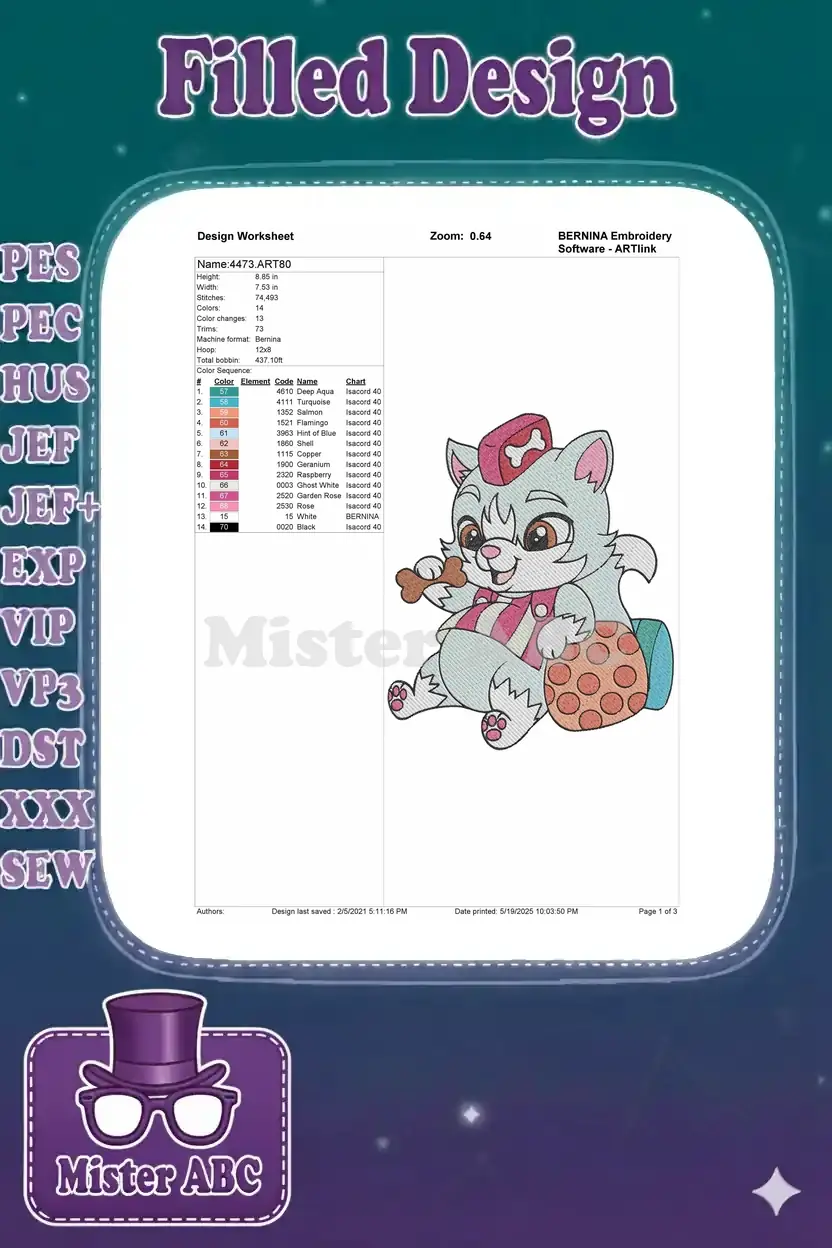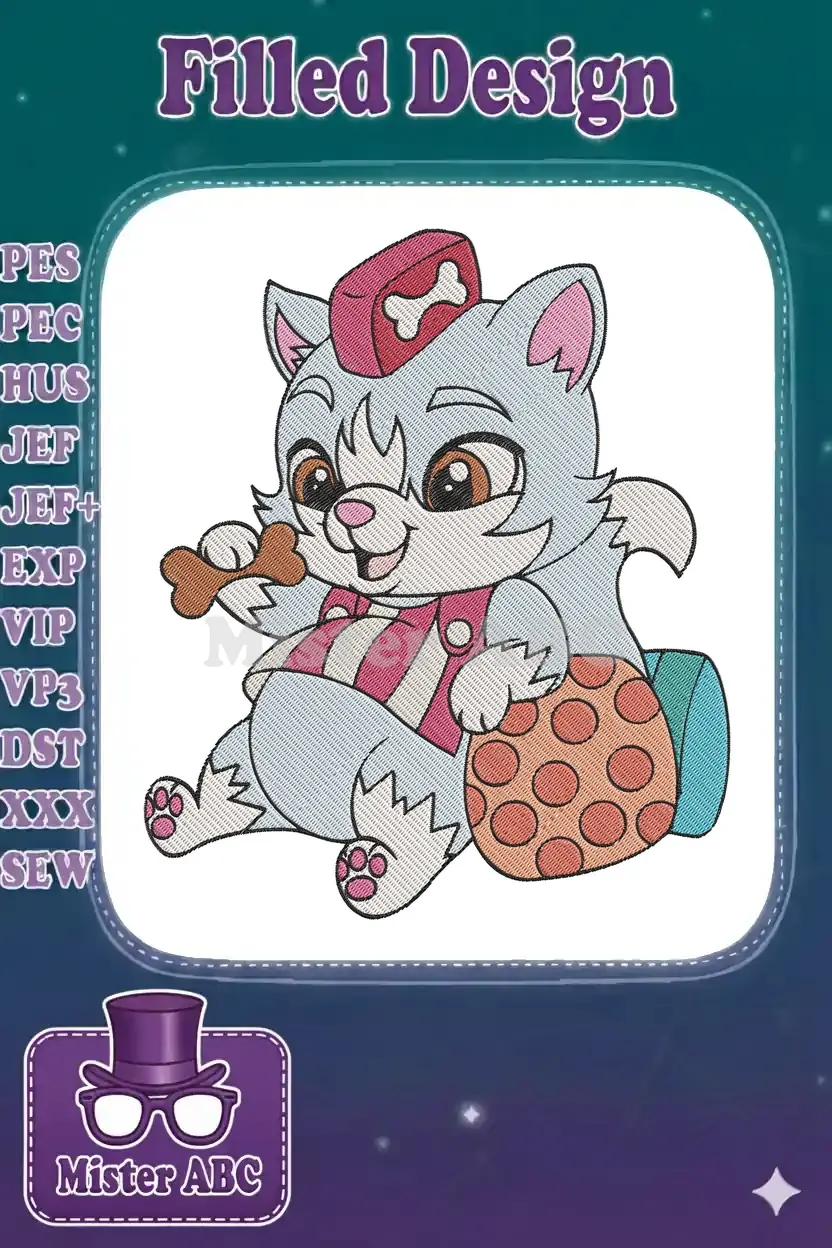 Charming machine embroidery design of a playful cat with a bone, food bowl hat, and ball. Perfect for children’s items.