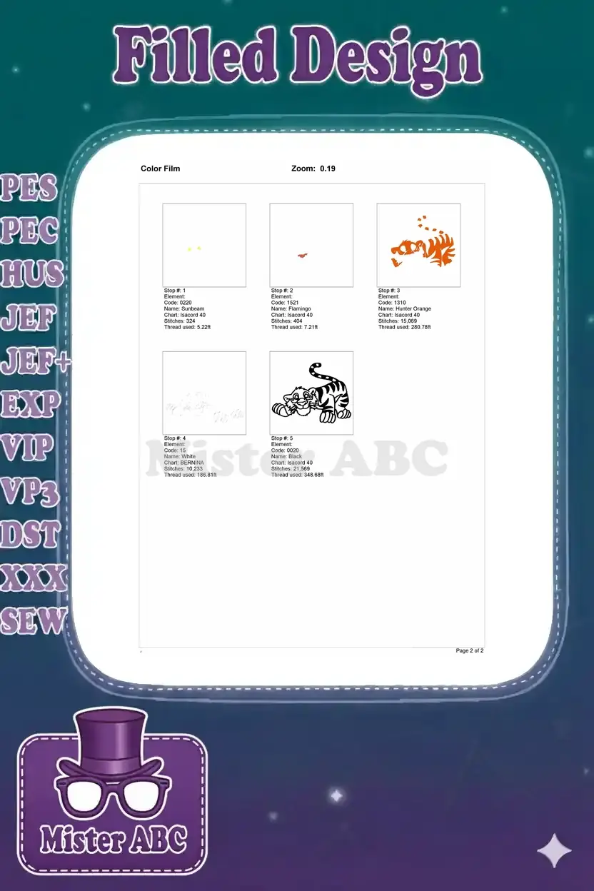 Adorable crouching cartoon tiger cub embroidery designs, ready to play