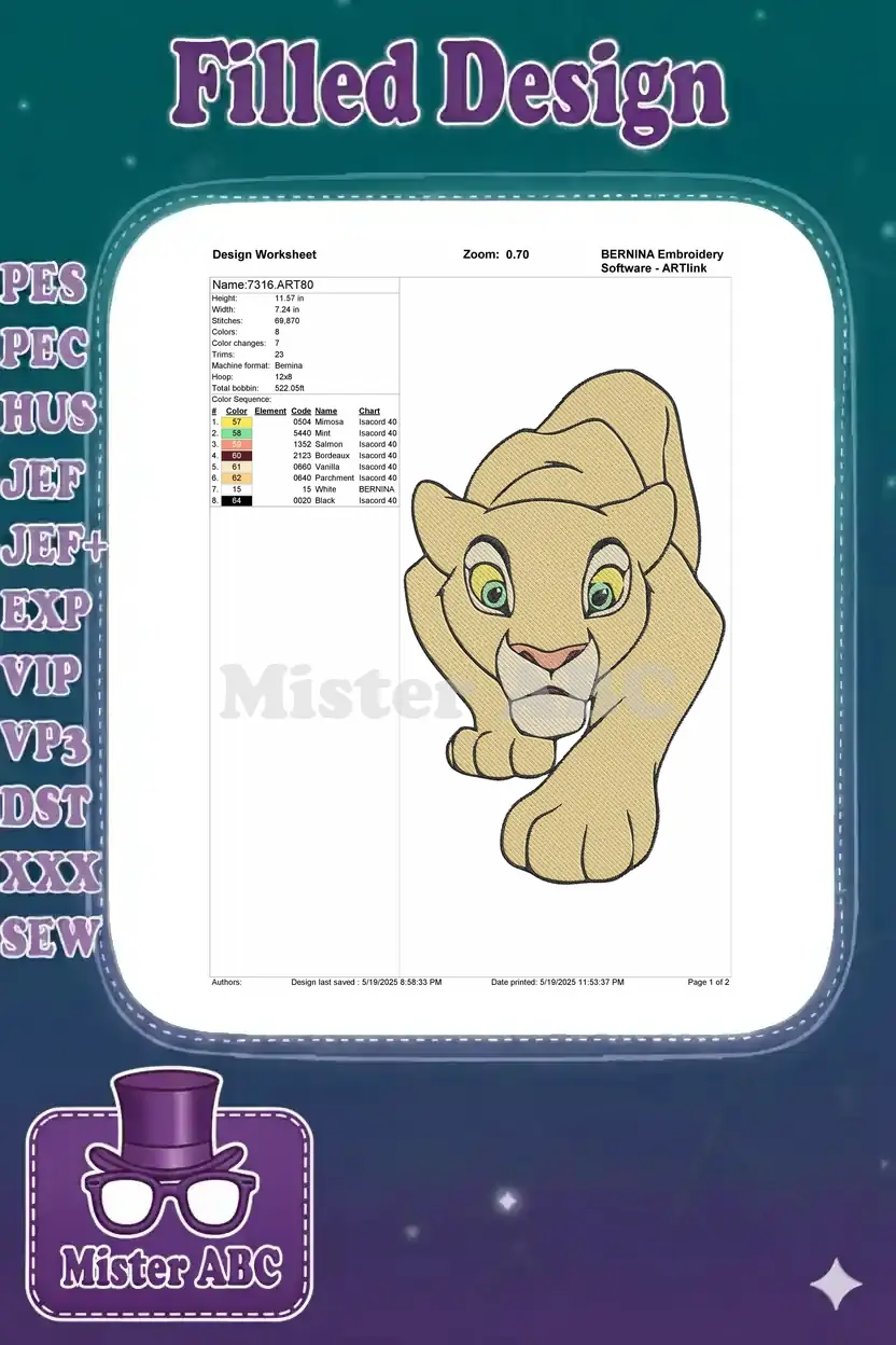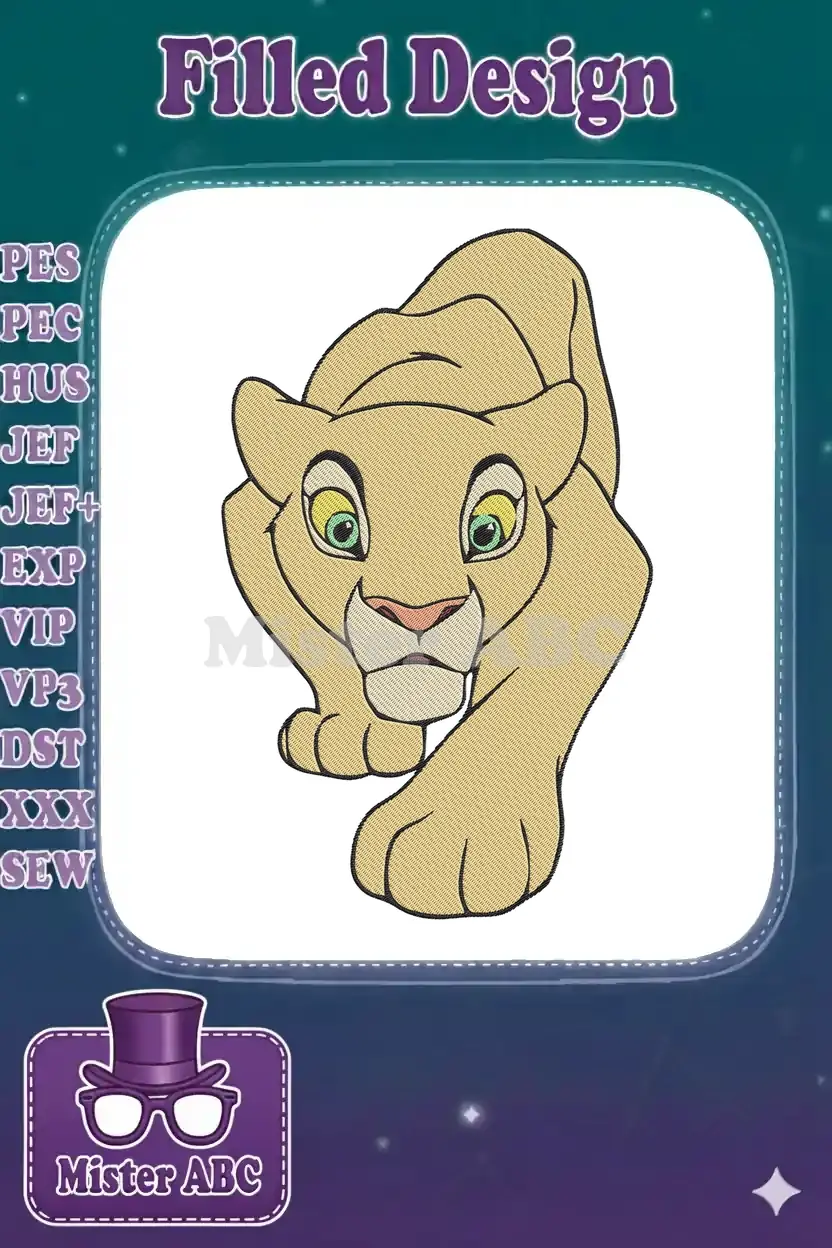 Capture the adventurous spirit of Nala with this vibrant embroidery design, perfect for fans of classic animated tales.