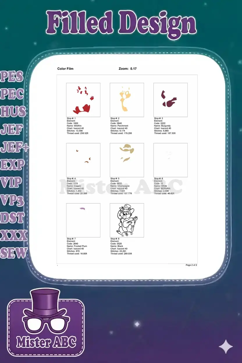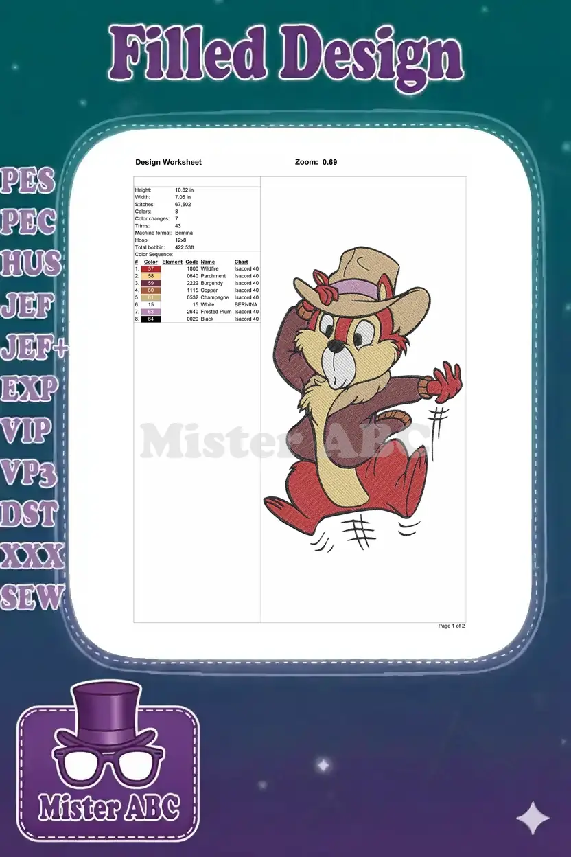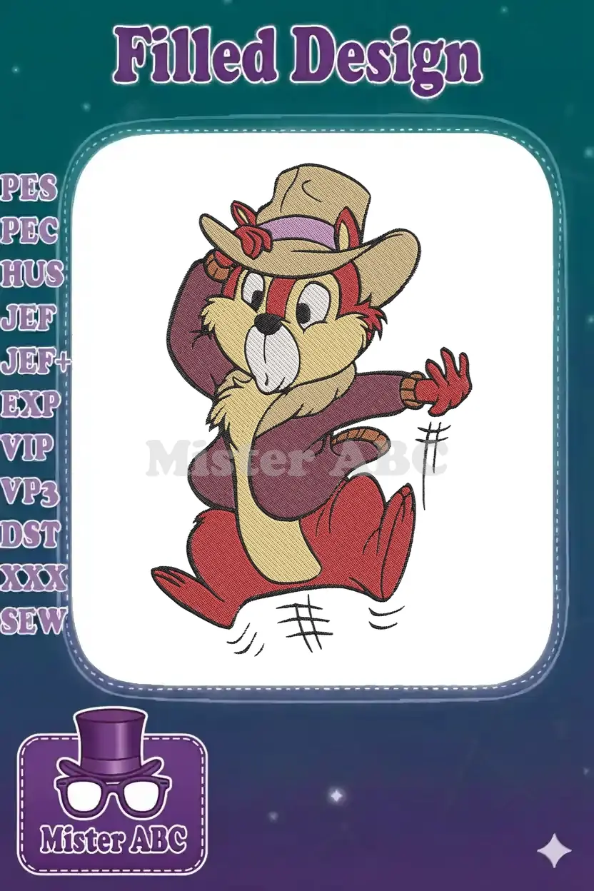 Capture the playful spirit with this detailed embroidery of Dale, ready for adventure in his iconic hat and jacket. Perfect for fans!