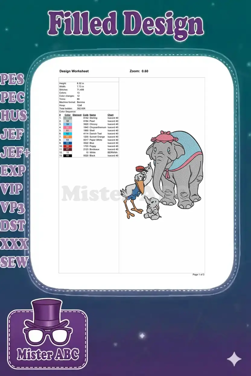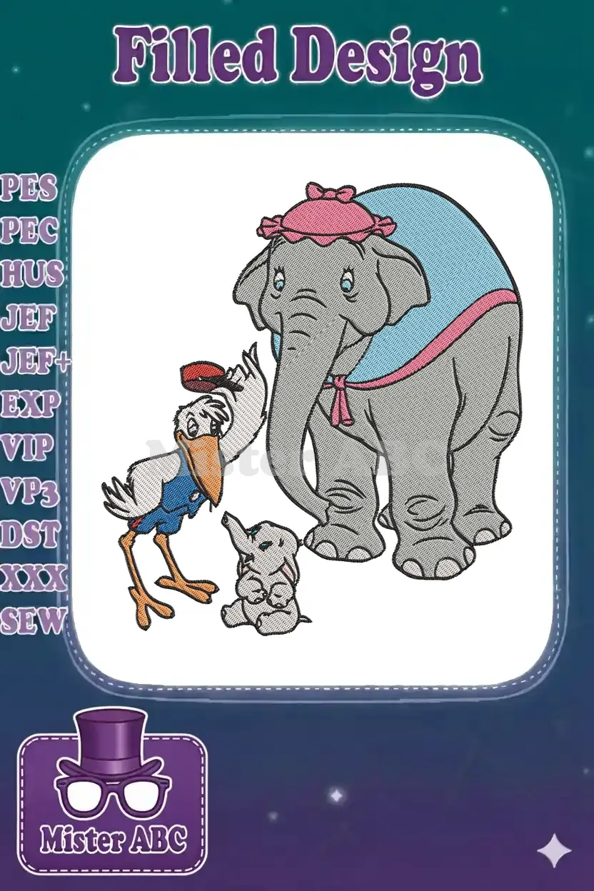 Adorable Dumbo Baby Elephant Stork and Mother Embroidery Designs