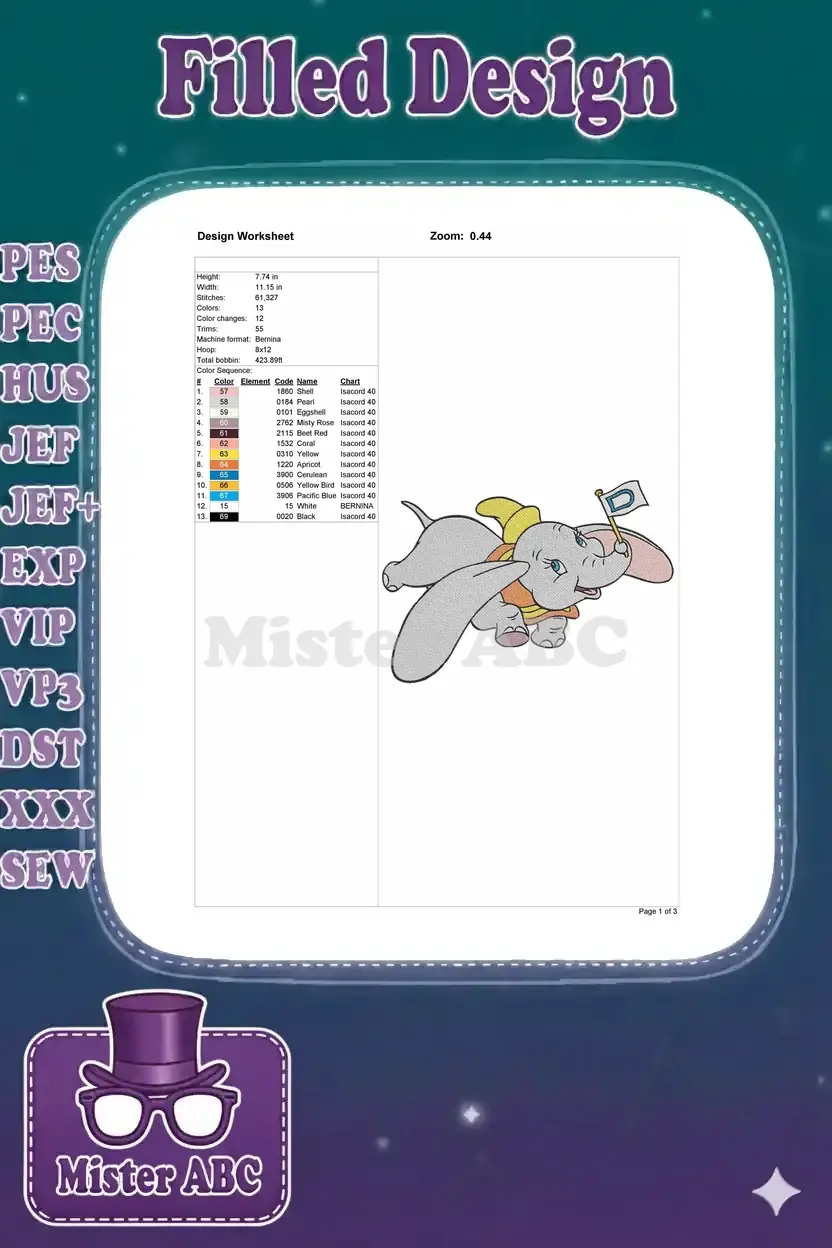 Adorable Dumbo flying elephant holding D flag embroidery designs