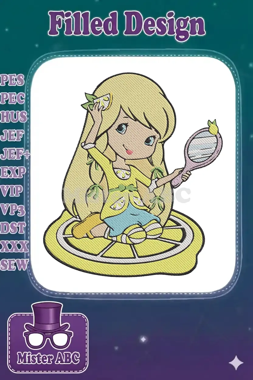 Adorable Lemon Girl Character Holding Mirror Embroidery Designs