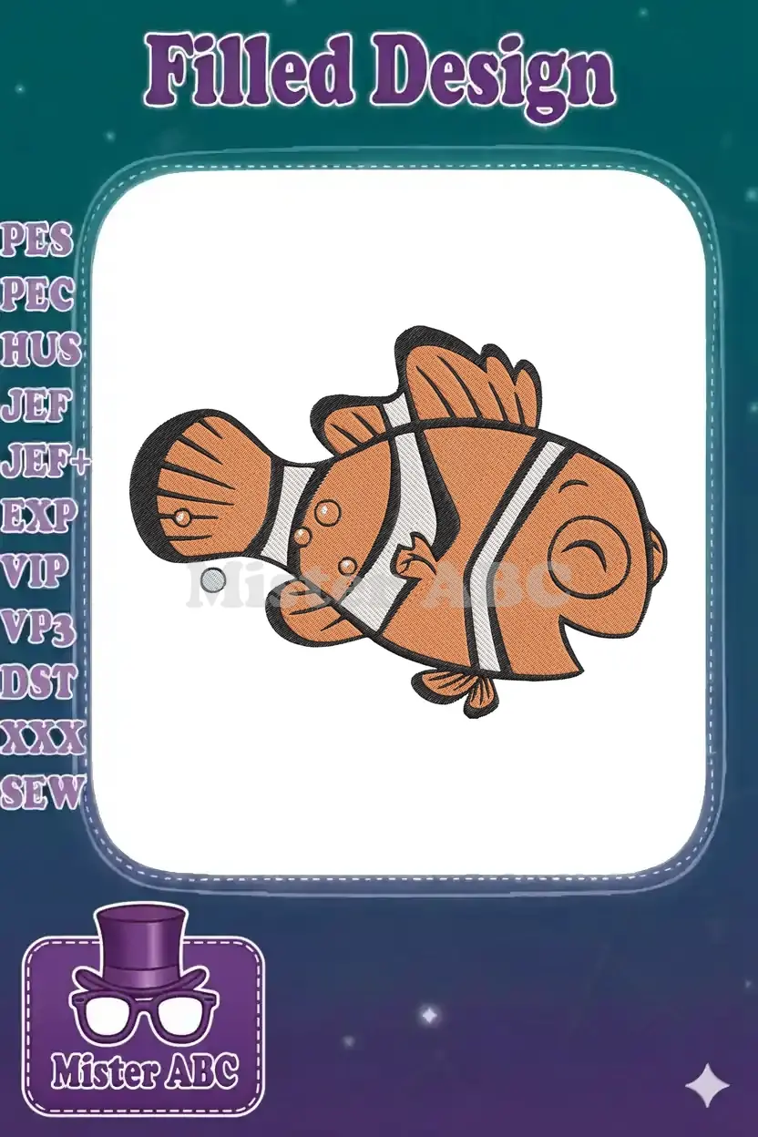 Adorable orange and white striped clown fish embroidery designs with bubbles