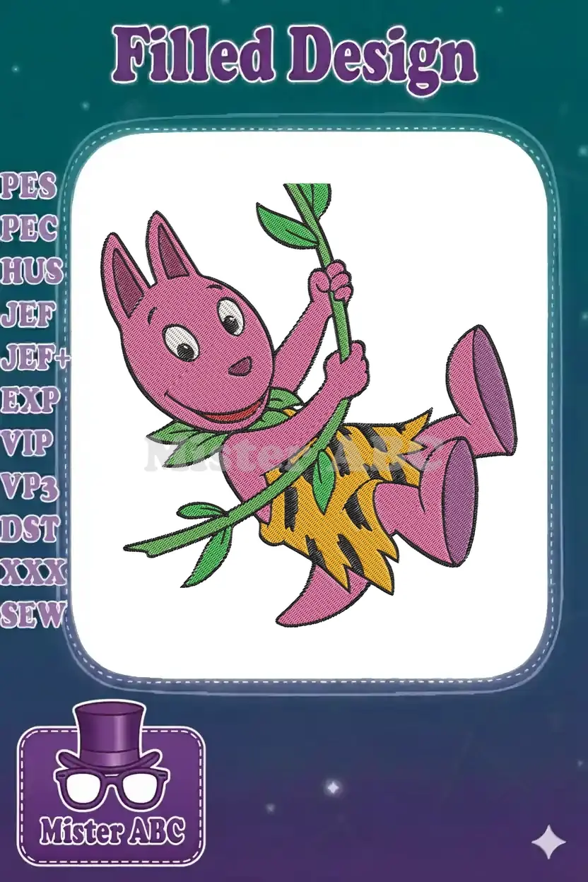 Adorable pink cartoon rabbit swinging on a jungle vine embroidery designs