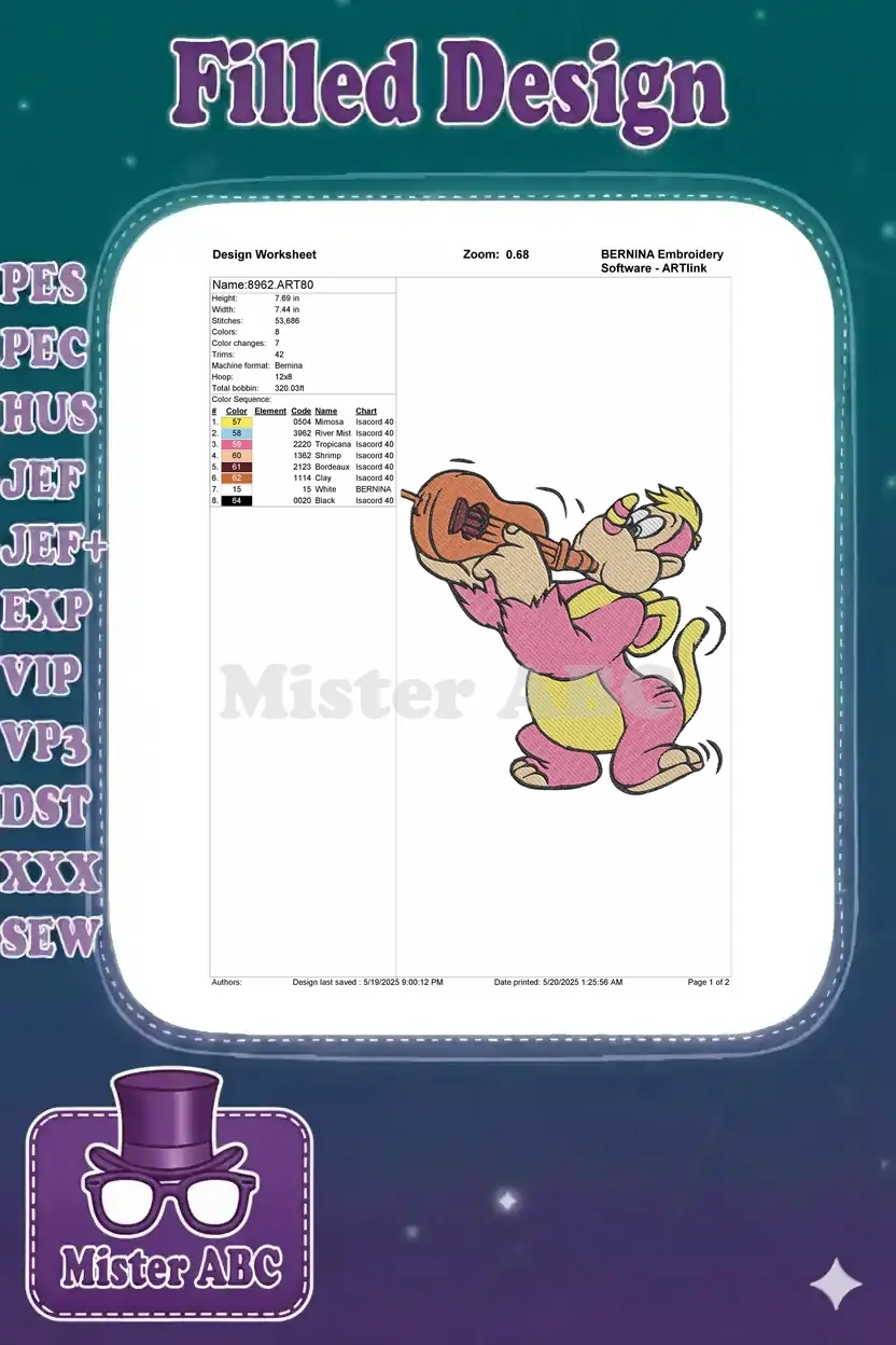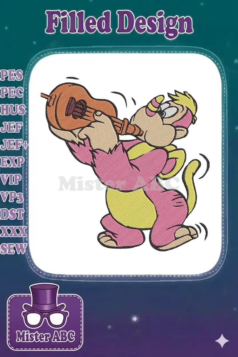 Add a touch of playful music to your projects with this vibrant embroidery design featuring a charming pink character strumming a ukulele. Perfect for kids’ apparel and fun accessories.