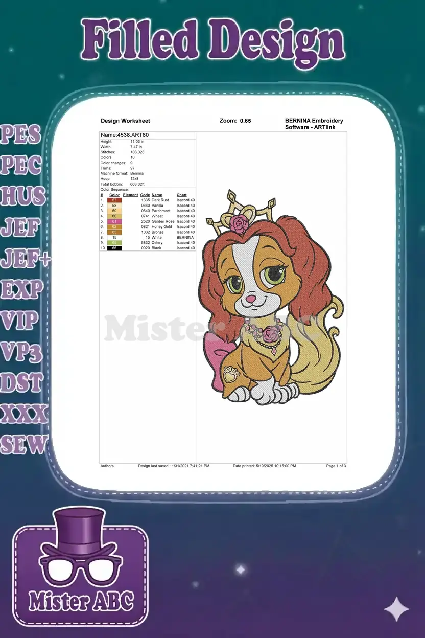 Adorable Princess Puppy Dog with Crown and Rose Necklace Embroidery Designs