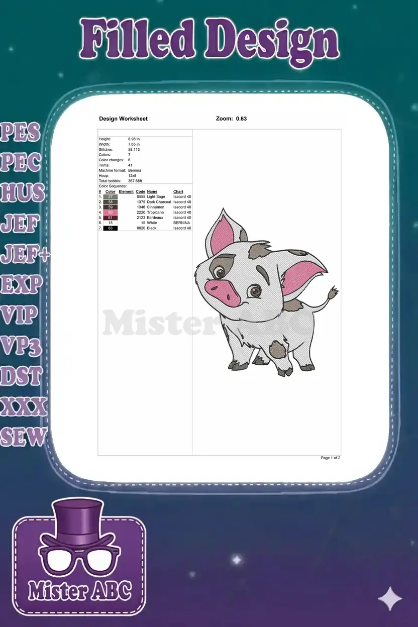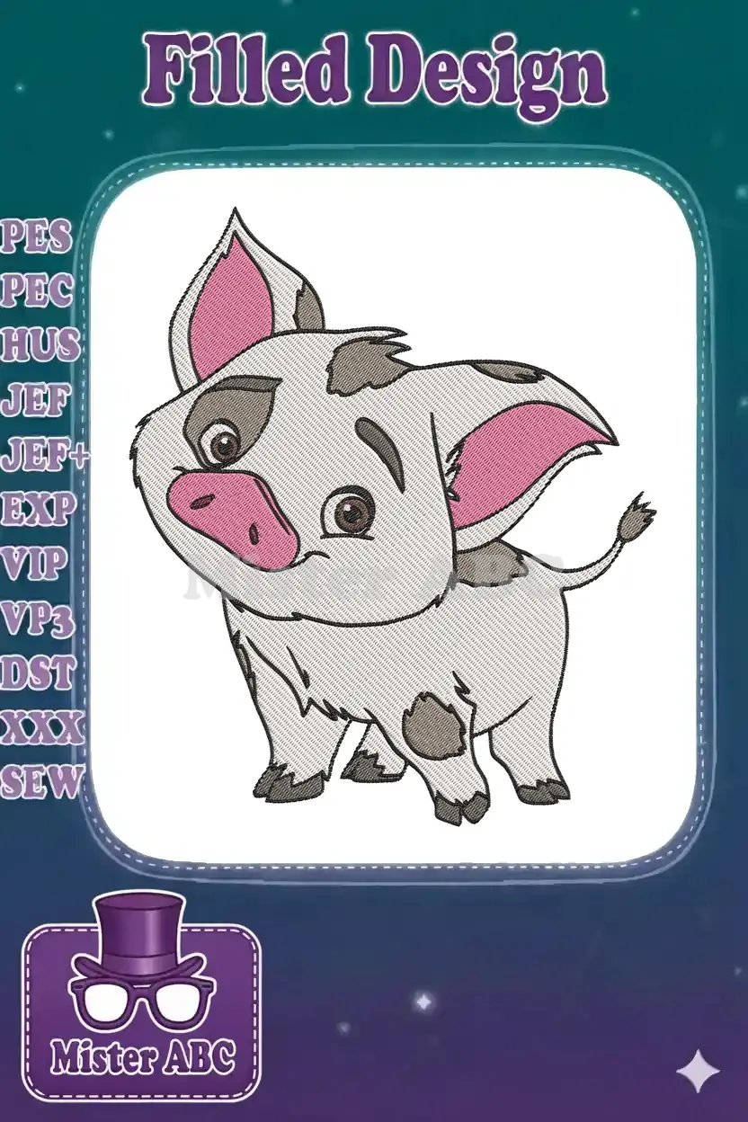 Charming Pua the pig embroidery design, perfect for Disney fans. A delightful addition to any project!