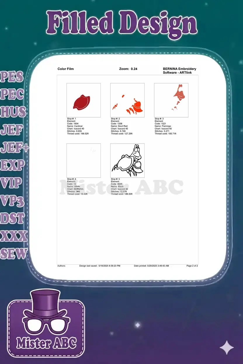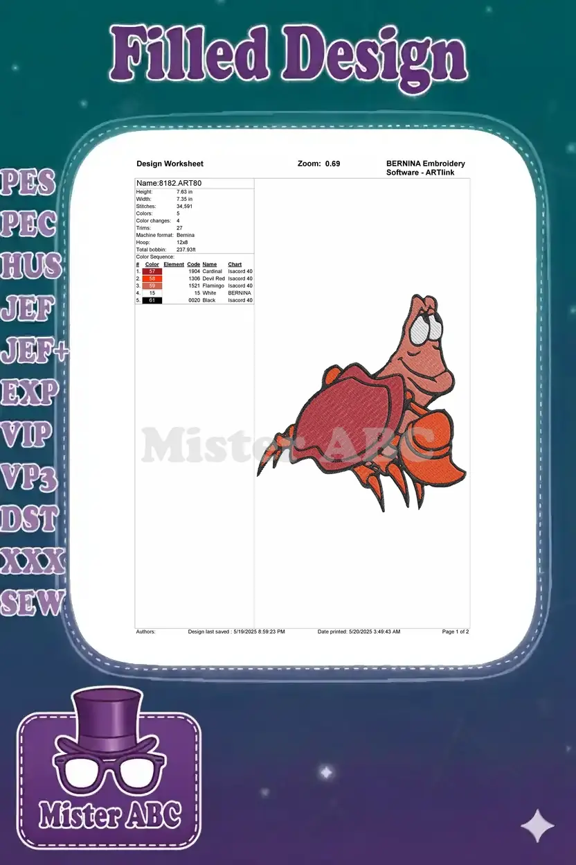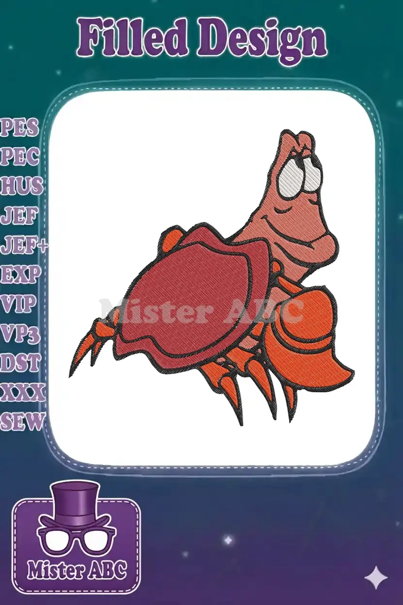 Delightful Sebastian crab embroidery design, perfect for fans of aquatic adventures and animated classics. Add a splash of fun to any project.