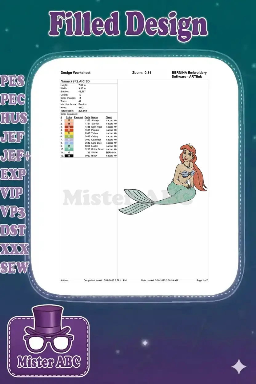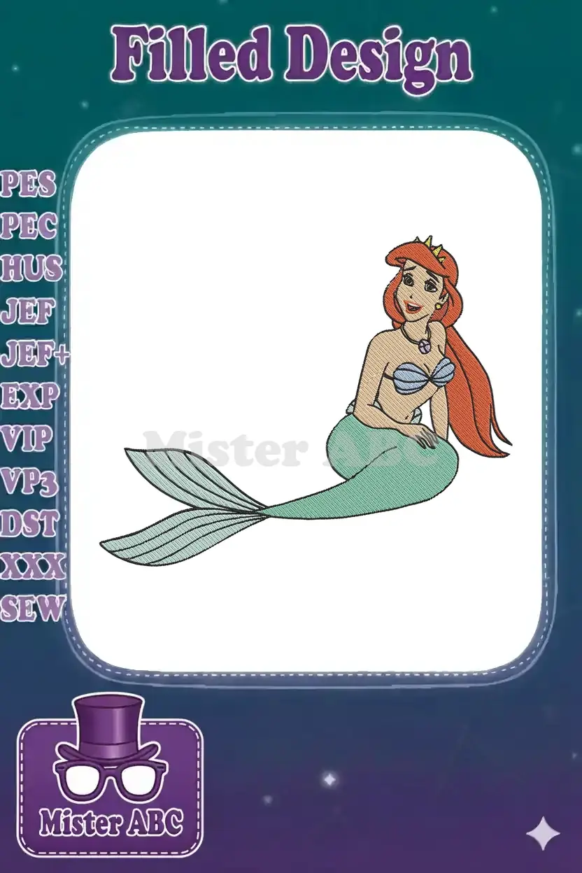 Adorable Red-Haired Mermaid Princess Green Tail Ocean Embroidery Designs