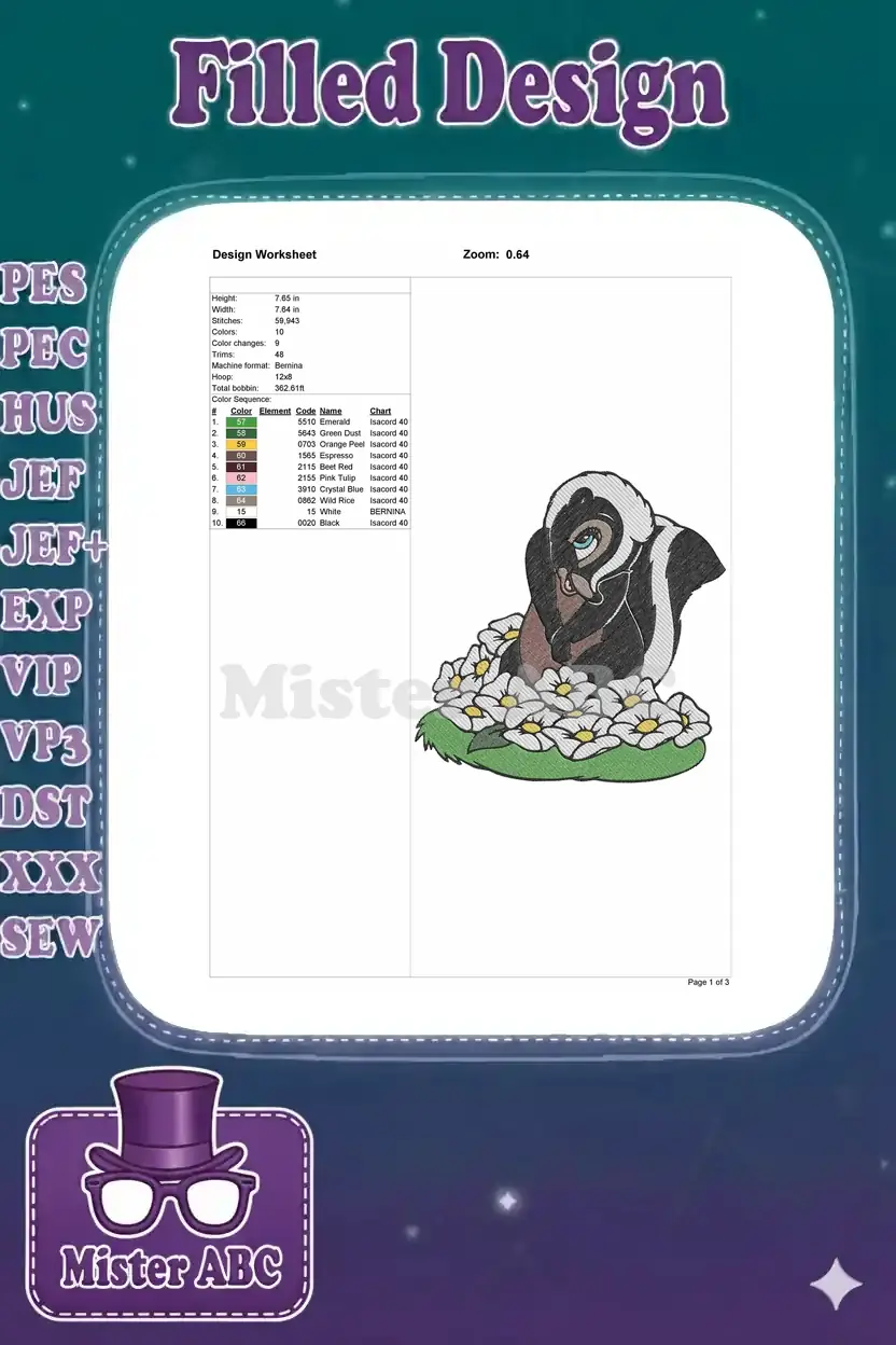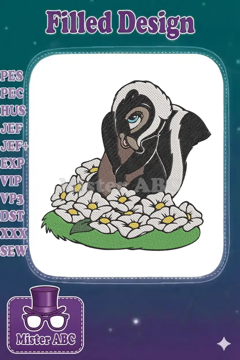 Adorable skunk peeking through white daisy flowers embroidery designs