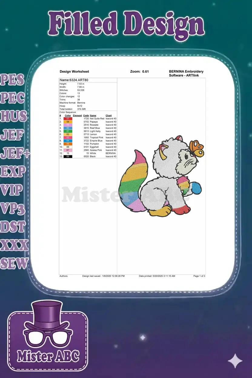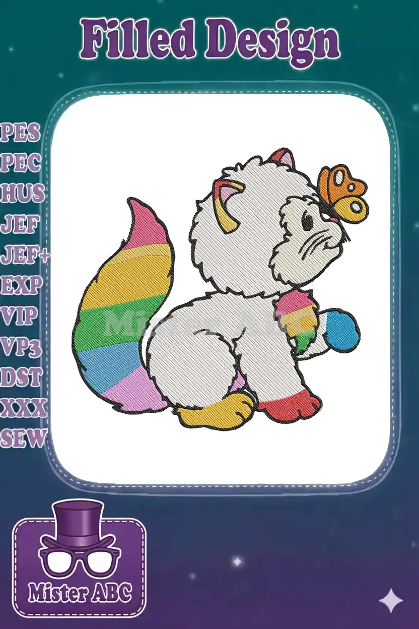Adorable white cat with colorful rainbow tail and butterfly embroidery designs