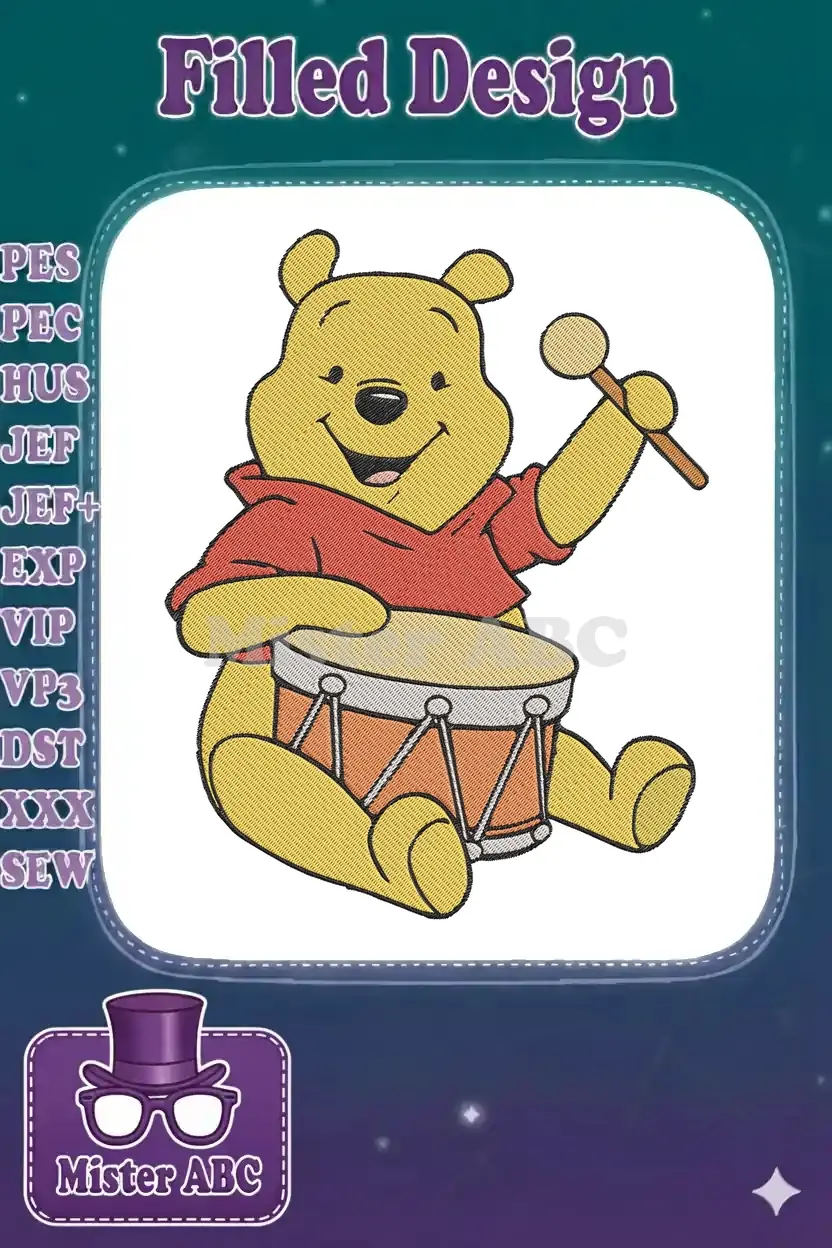Bring joy to any project with this adorable Winnie the Pooh playing a drum embroidery design! Perfect for children’s items.