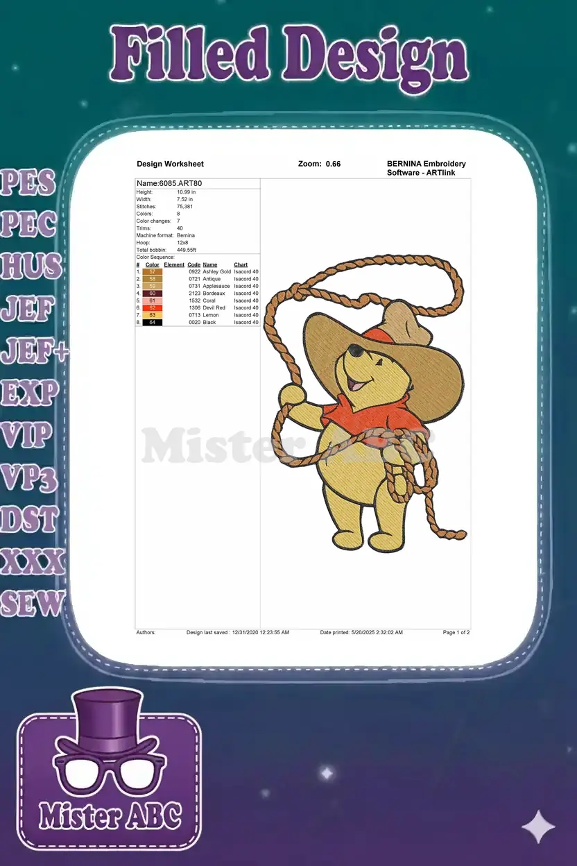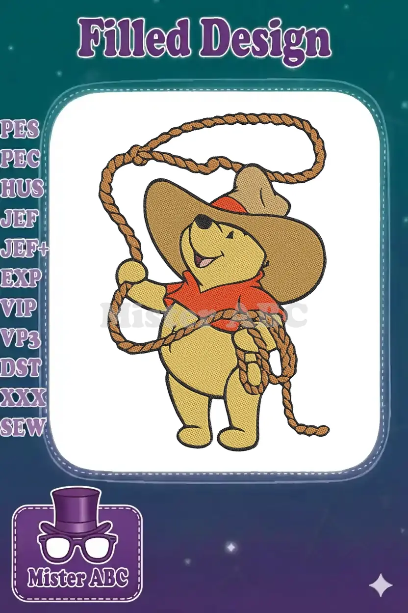 Adorable Winnie the Pooh cowboy with lasso rope embroidery designs