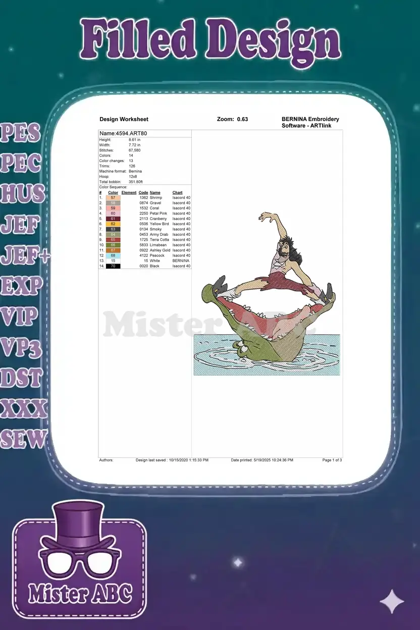 Adventurous boy leaping from snapping crocodile mouth embroidery designs