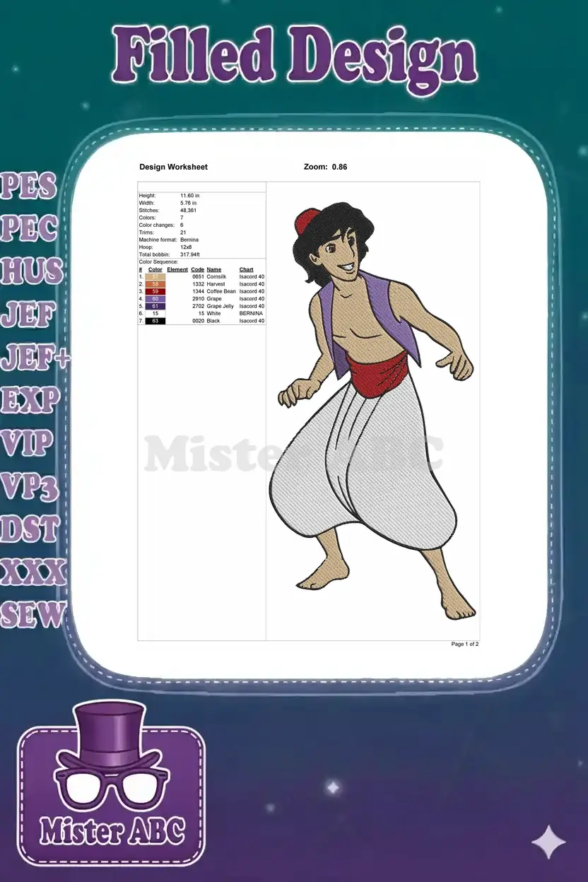 Aladdin Disney cartoon character with purple vest embroidery designs