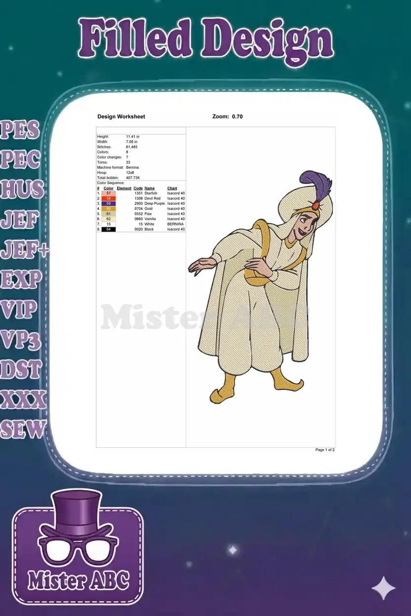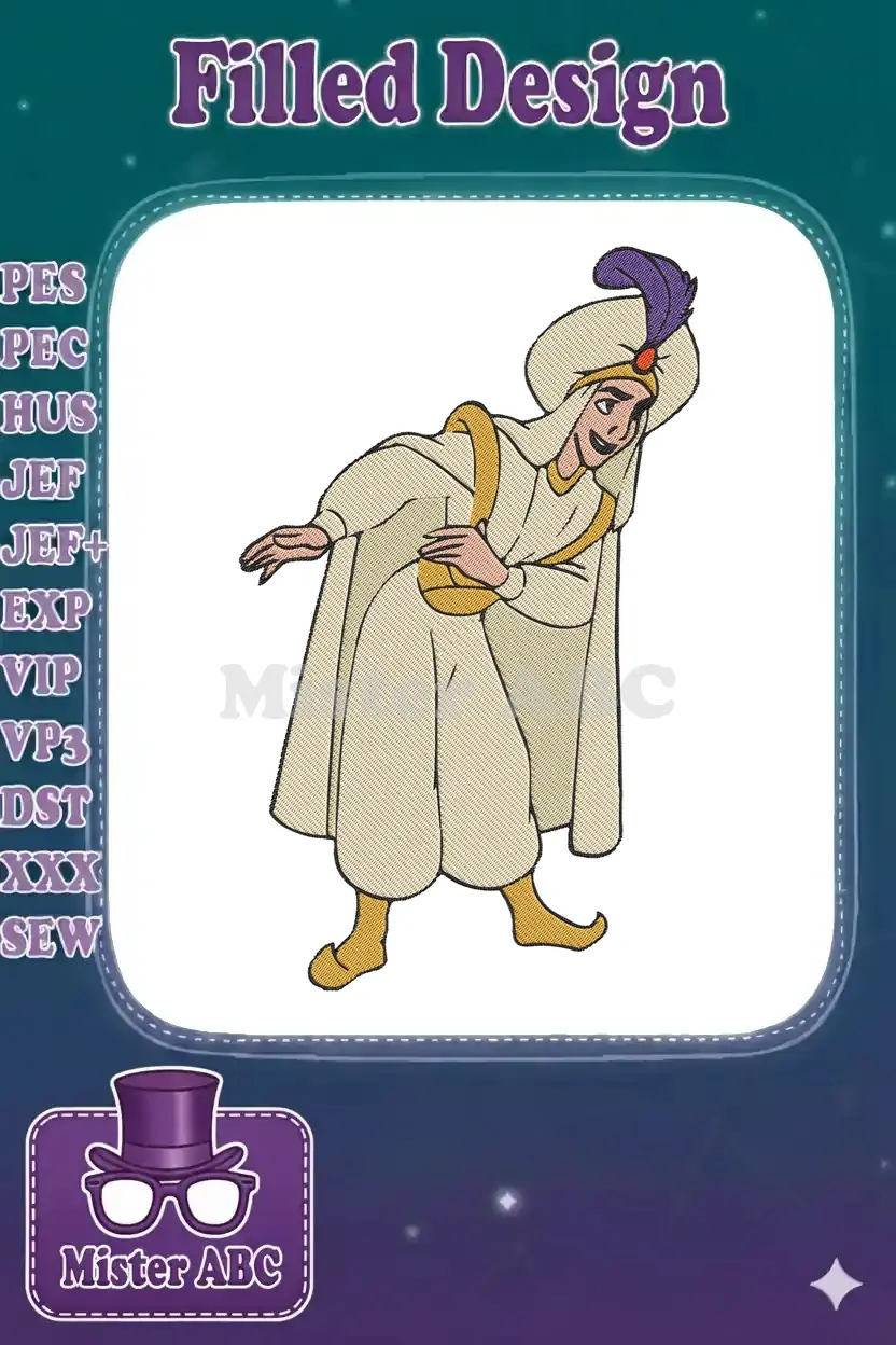 Add a touch of magic to your projects with this vibrant embroidery design of Prince Ali from Aladdin. Perfect for fans!