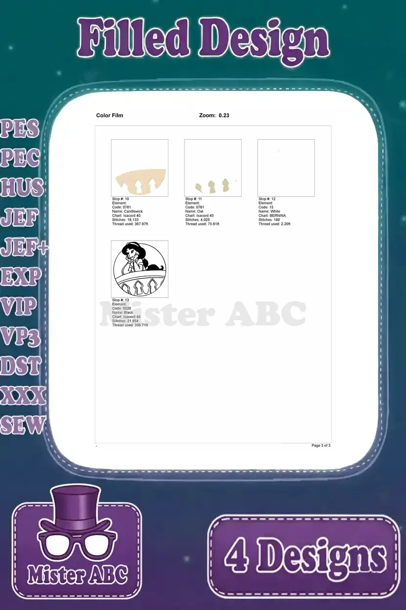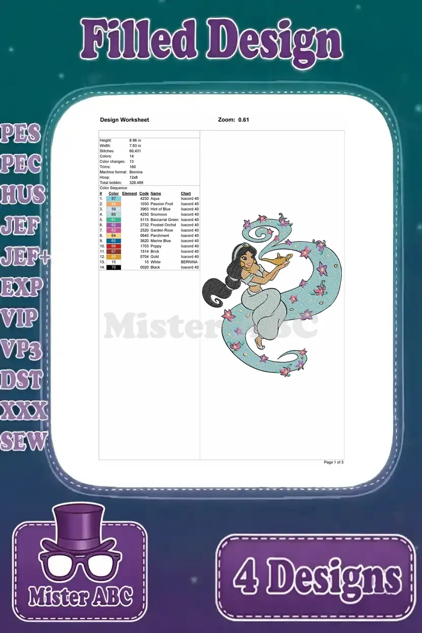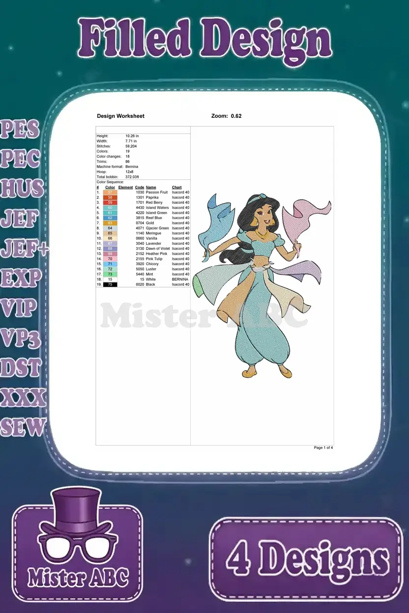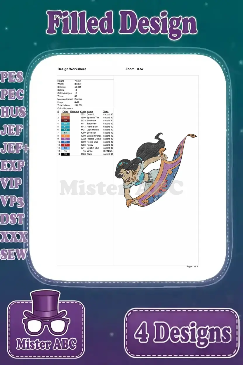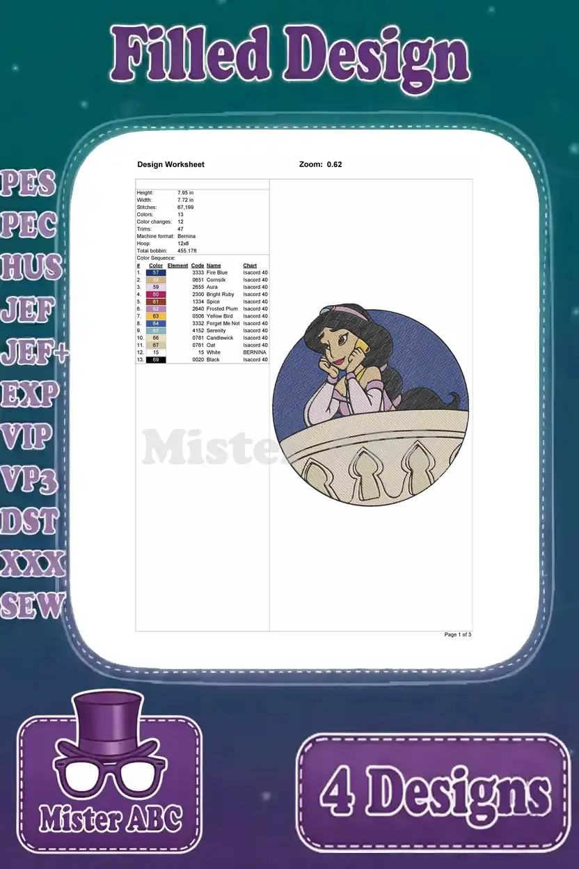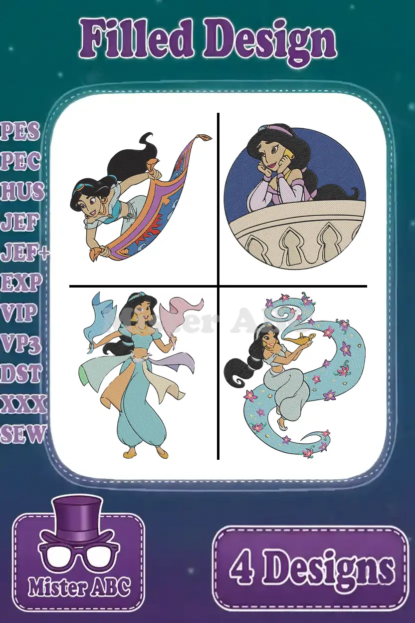 Aladdin Princess Jasmine On Magic Carpet Balcony Scene And By Dragon Fountain – Filled Embroidery Design