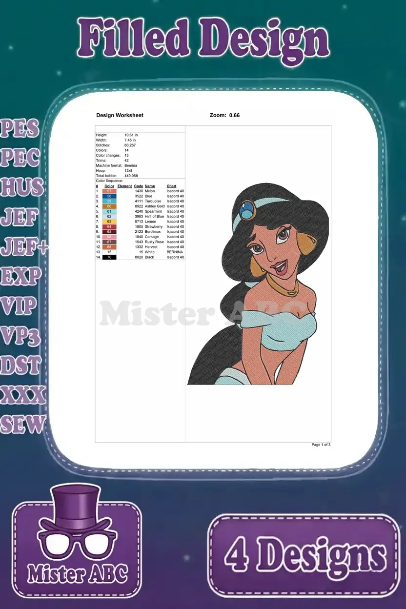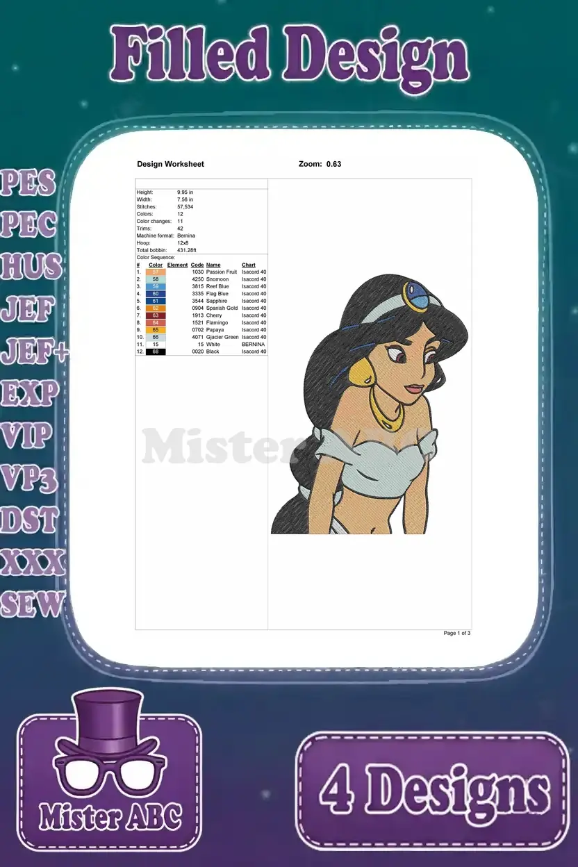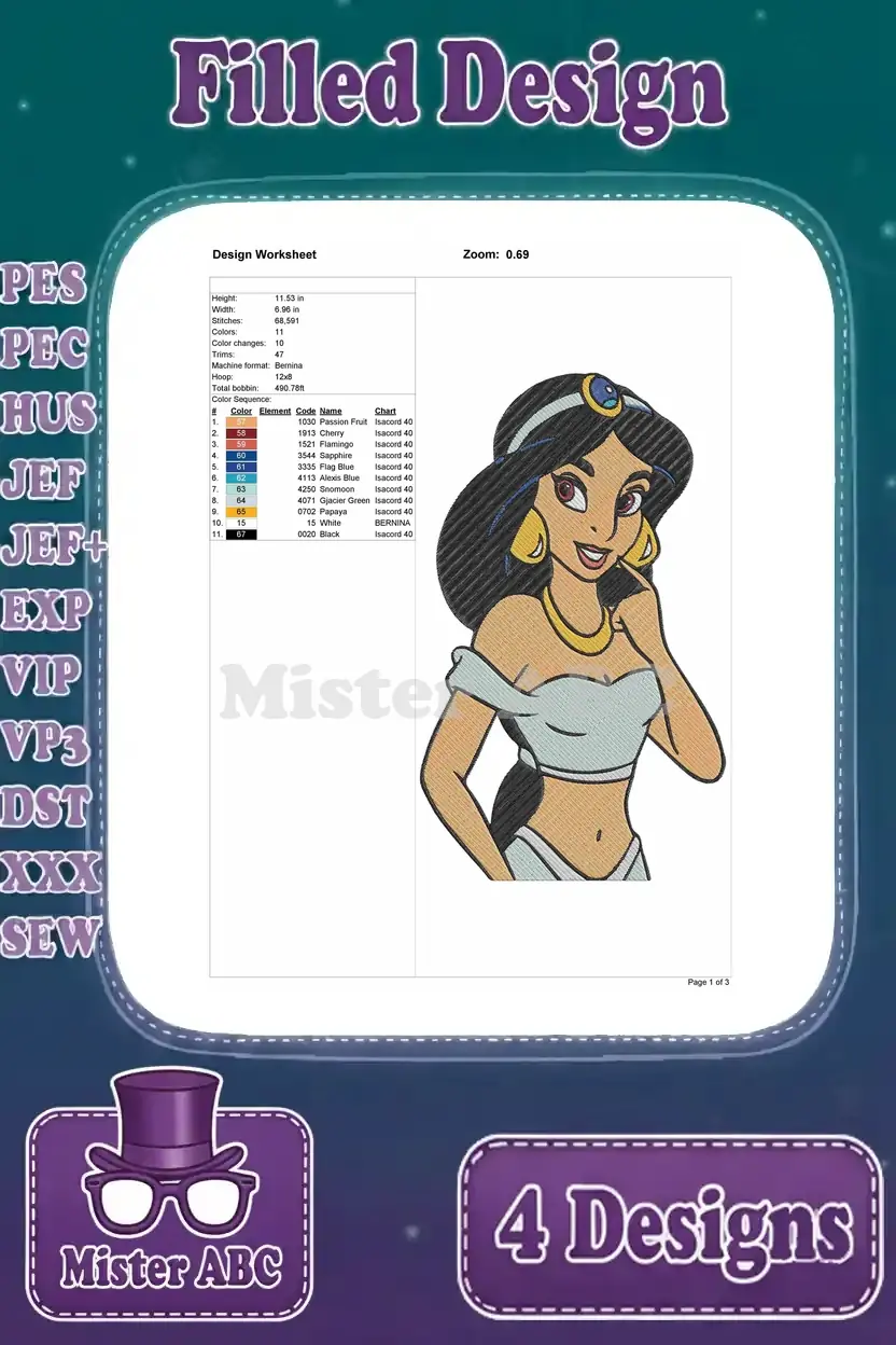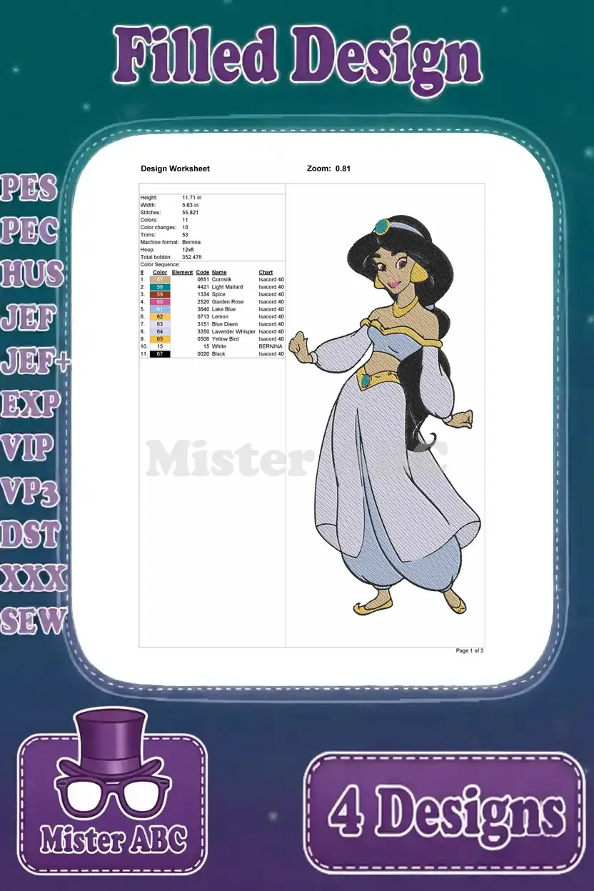 Aladdin Princess Jasmine In Purple And Blue Outfits Portraits And Full Figure Shot – Filled Embroidery Design