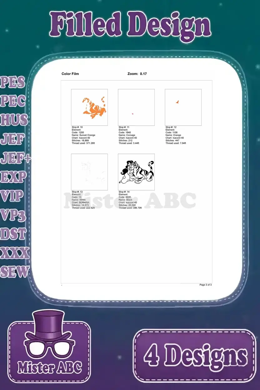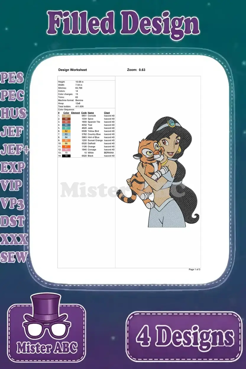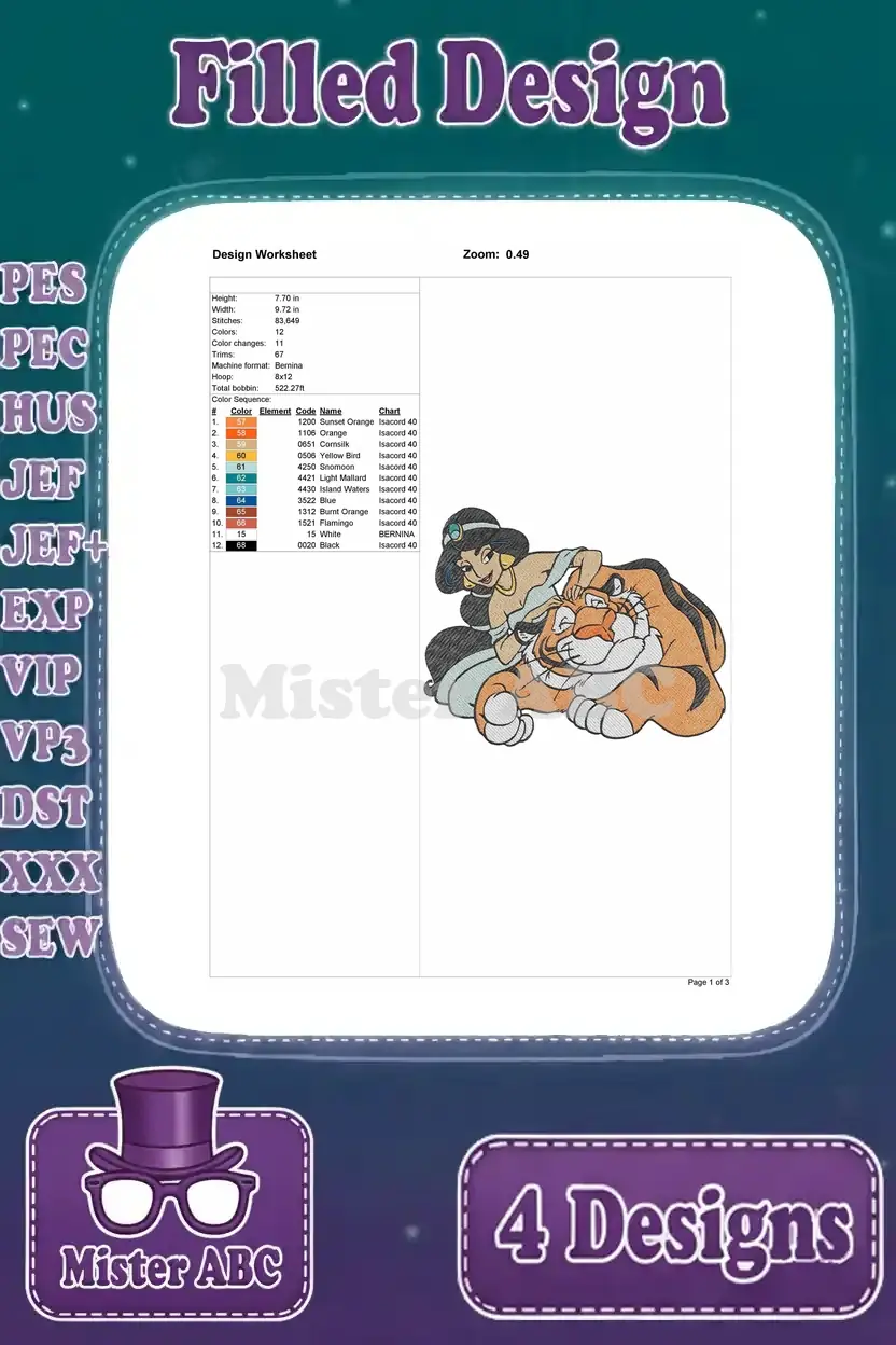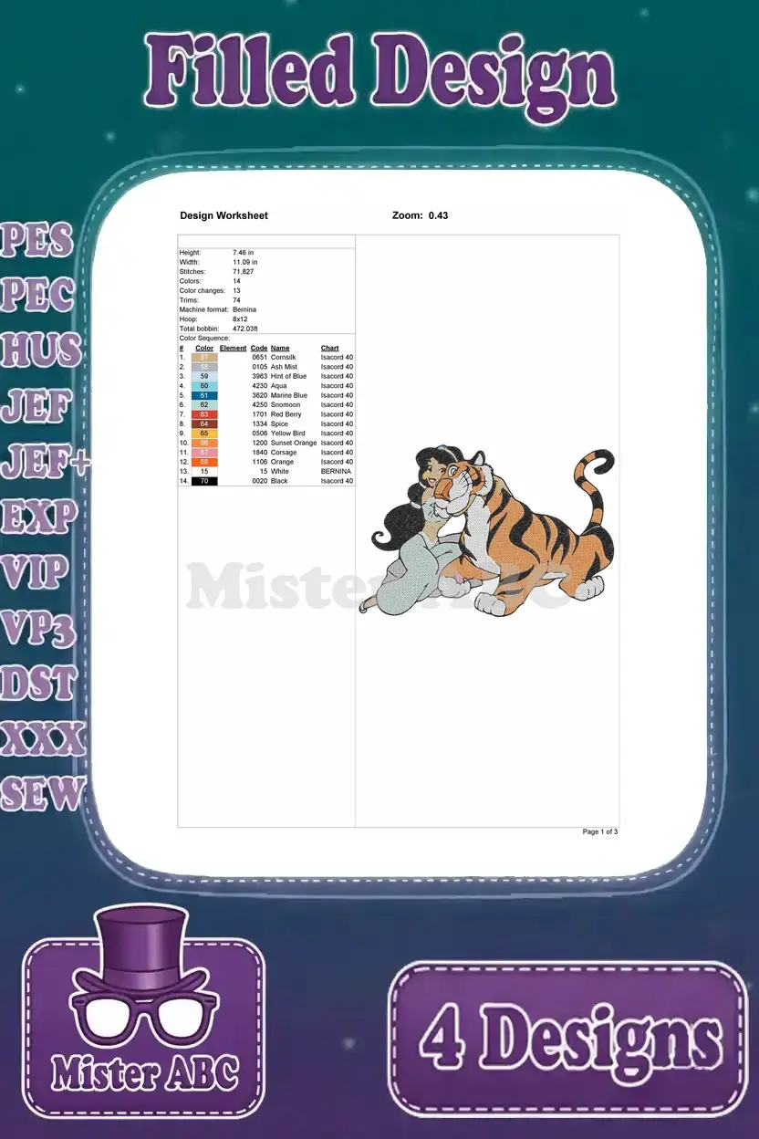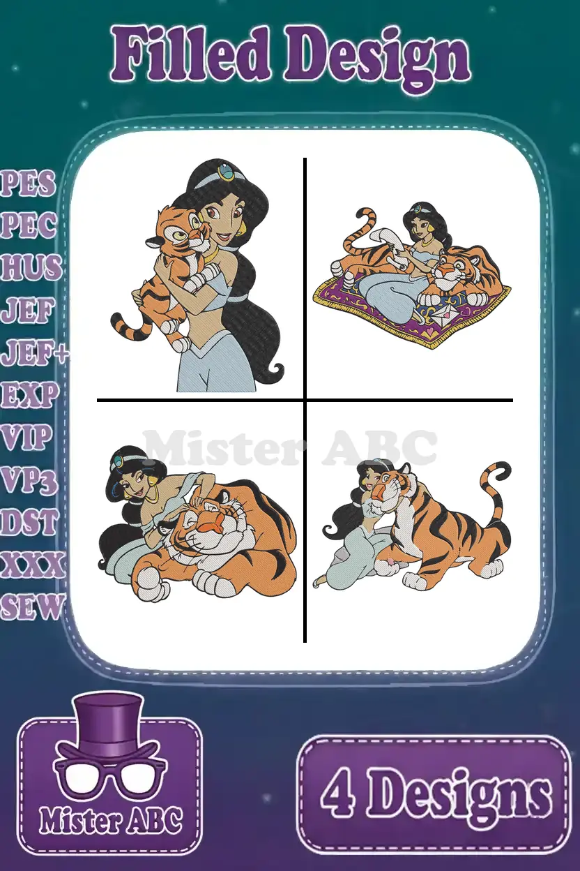 Aladdin Princess Jasmine Relaxing And Posing With Rajah Her Pet Tiger Scenes – Filled Embroidery Design