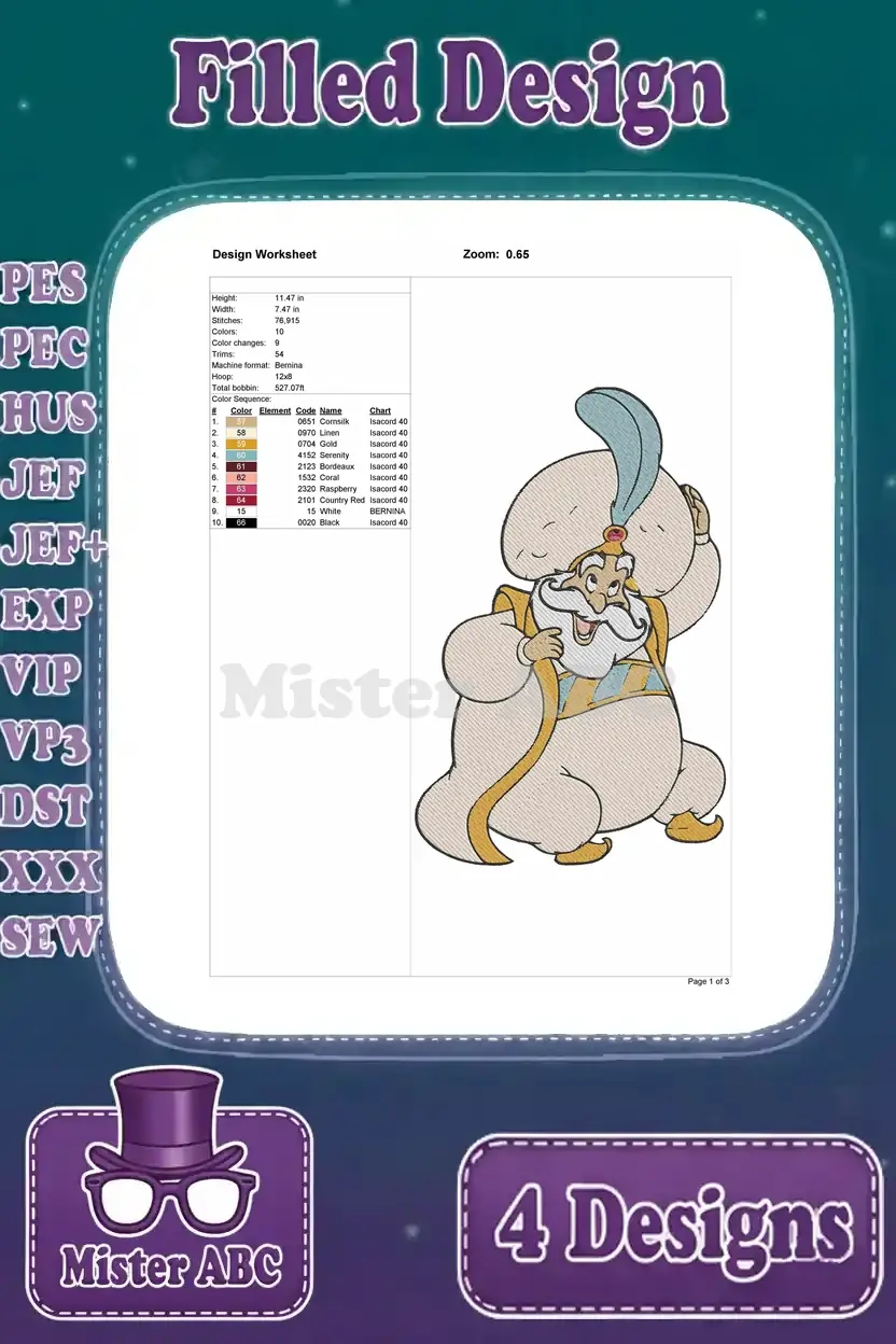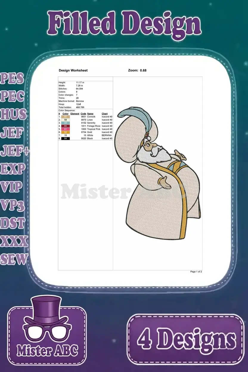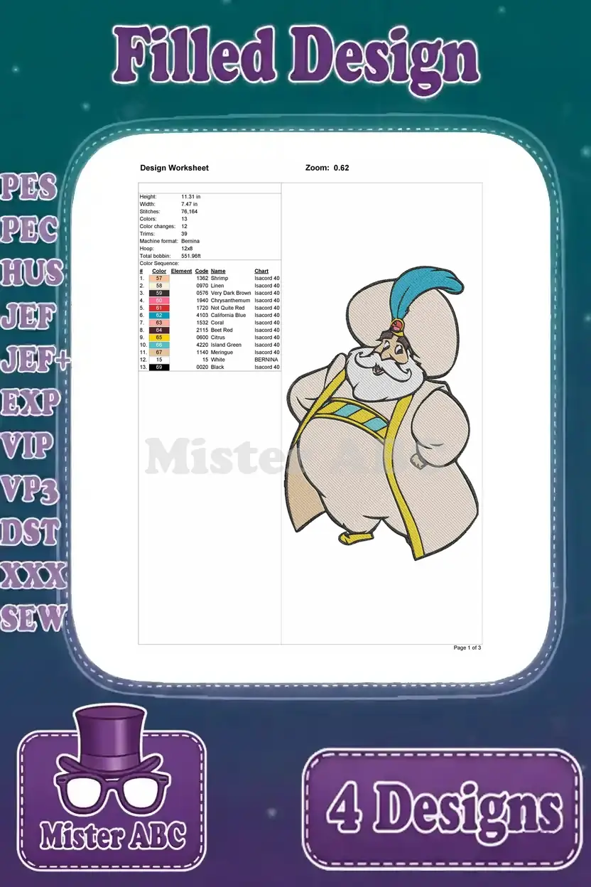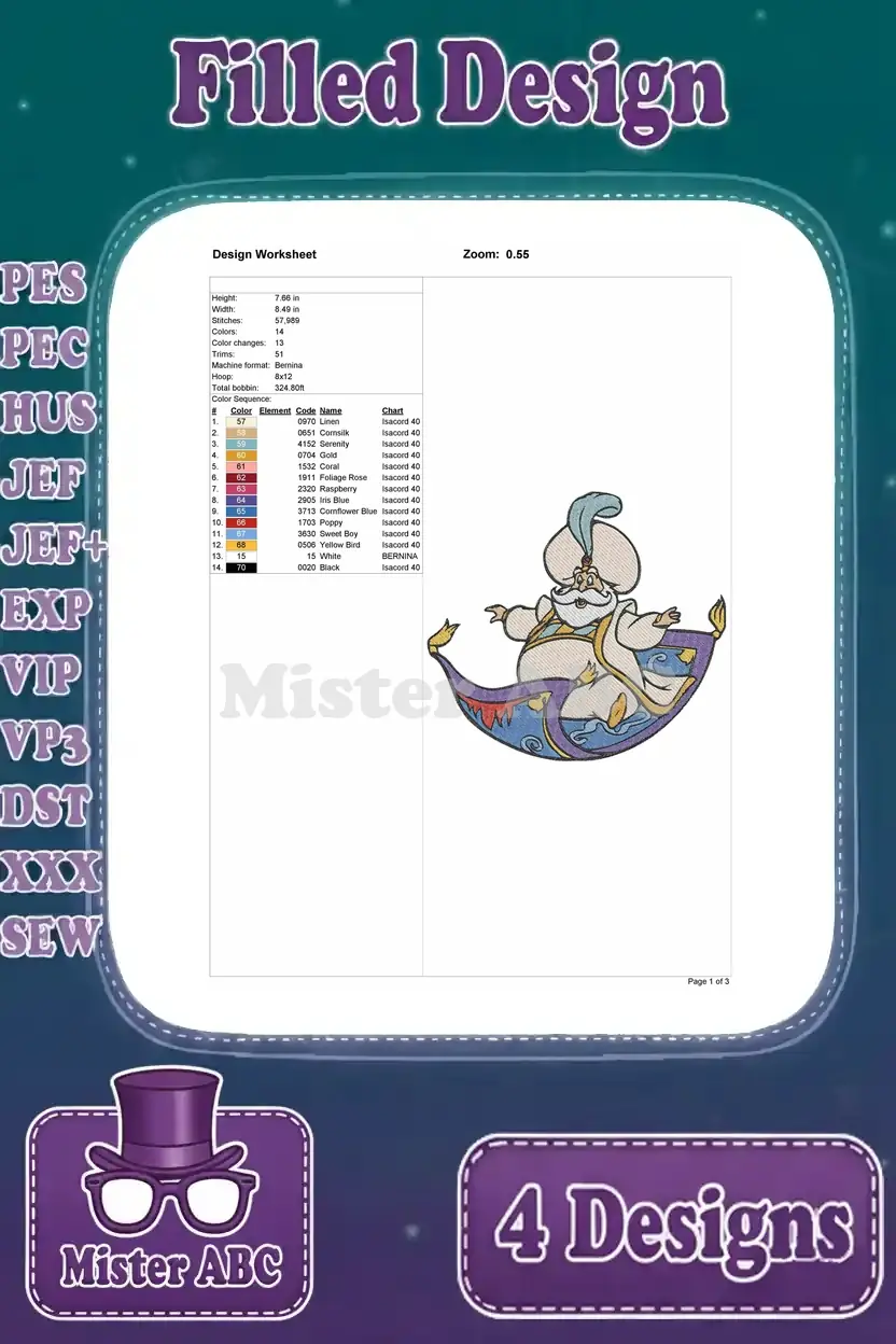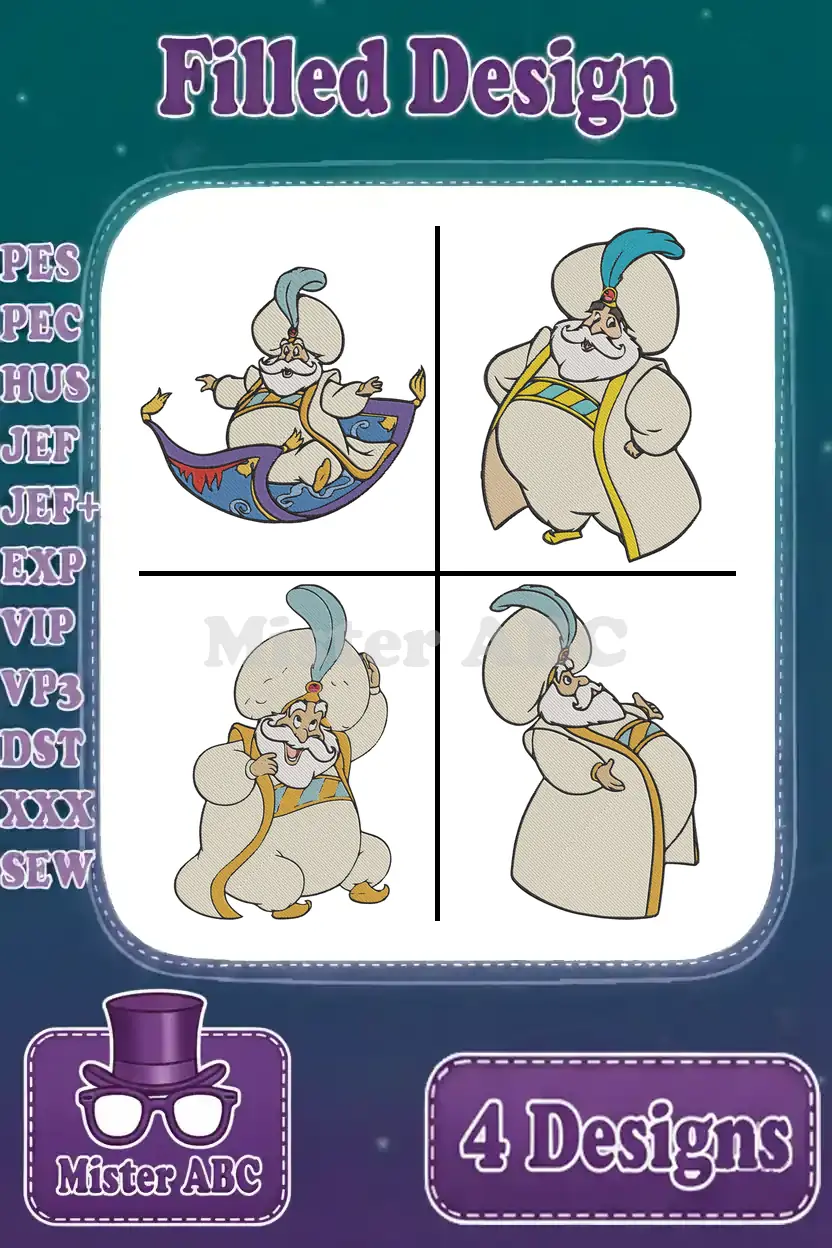 Aladdin Sultan Of Agrabah On Magic Carpet And Various Standing Royal Poses – Filled Embroidery Design
