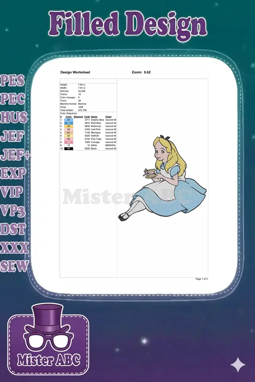 Whimsical Alice in Wonderland embroidery design, perfect for adding a touch of classic fantasy to any fabric project.
