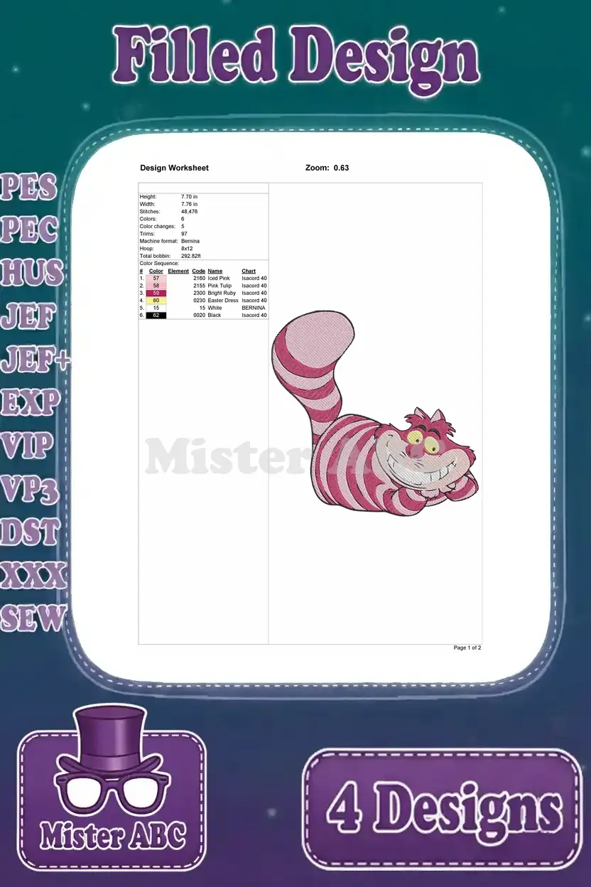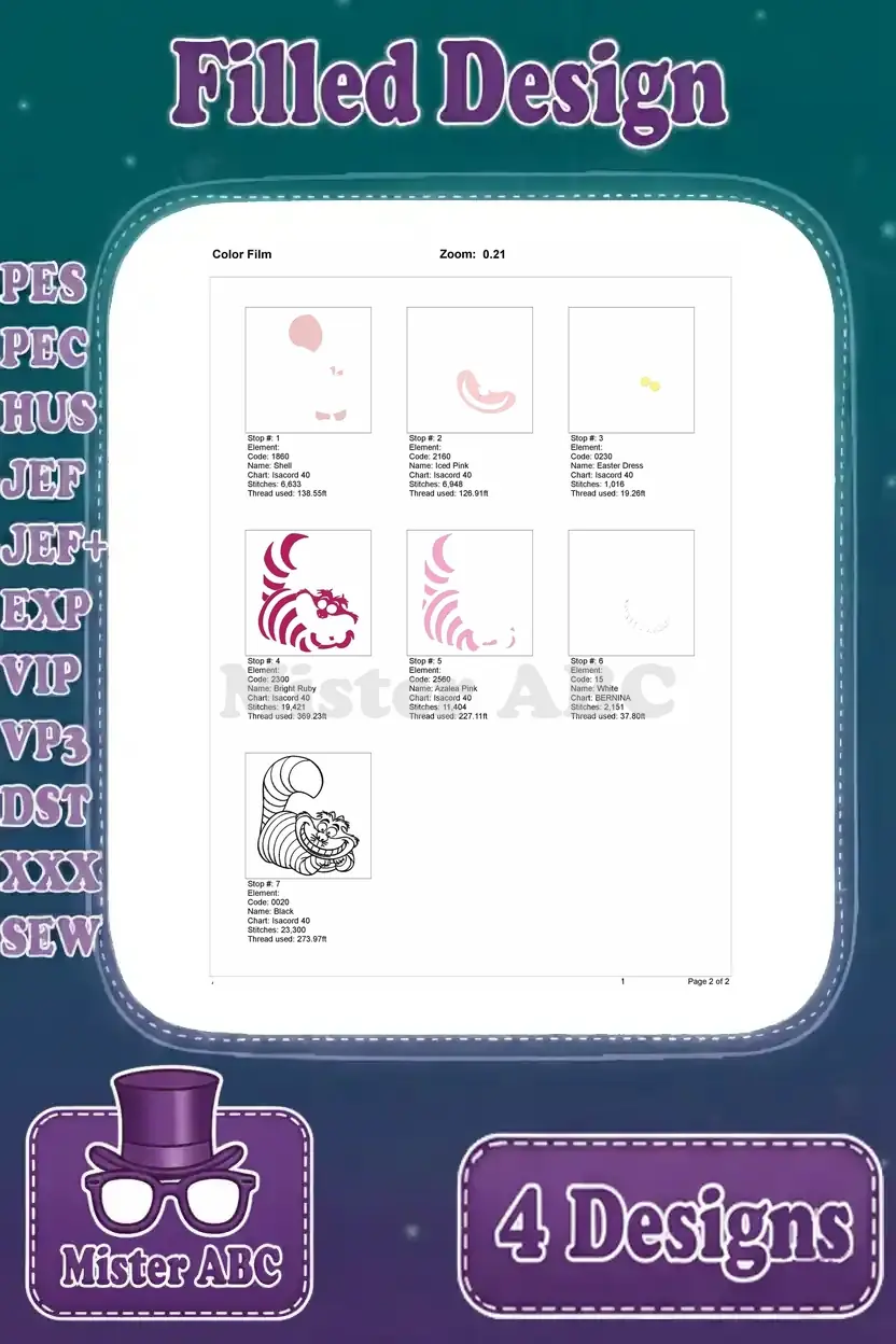 Dive into Wonderland with this Cheshire Cat embroidery bundle! Four filled designs in various poses for whimsical projects.
