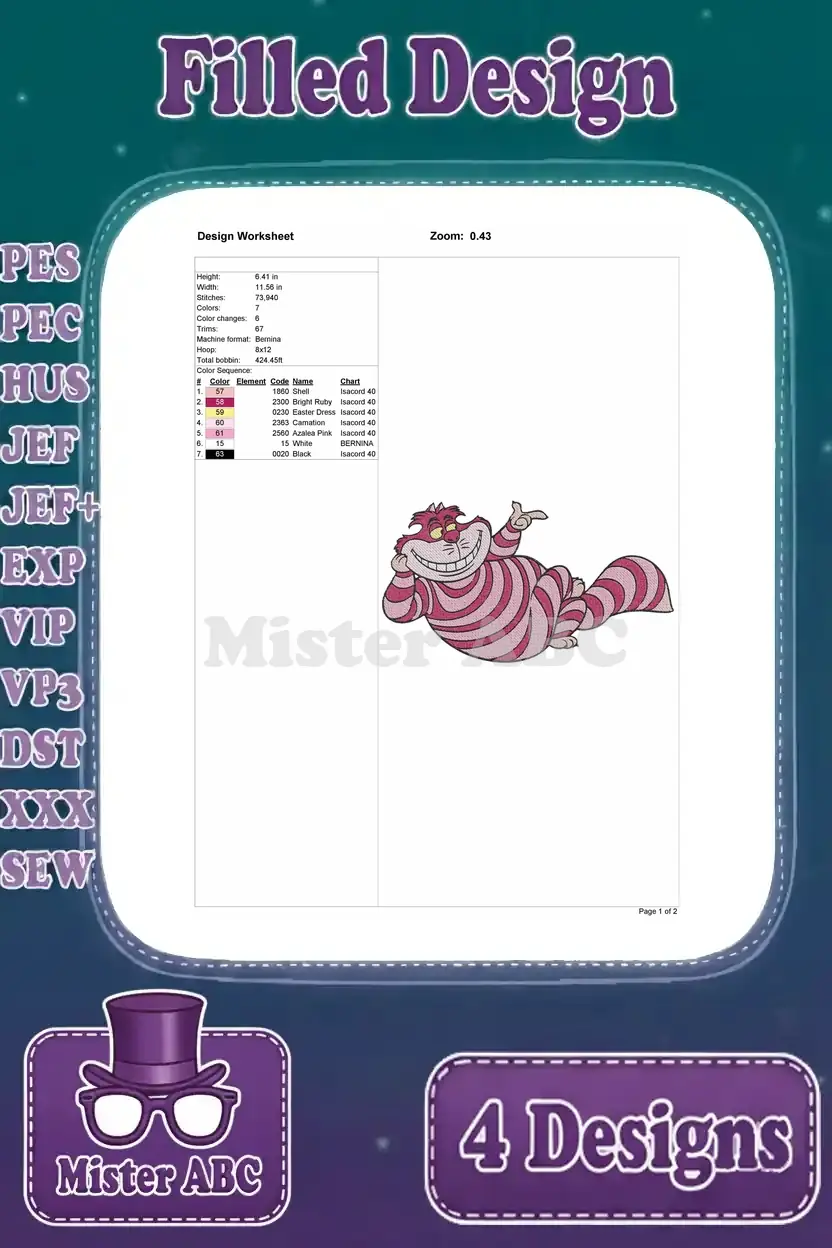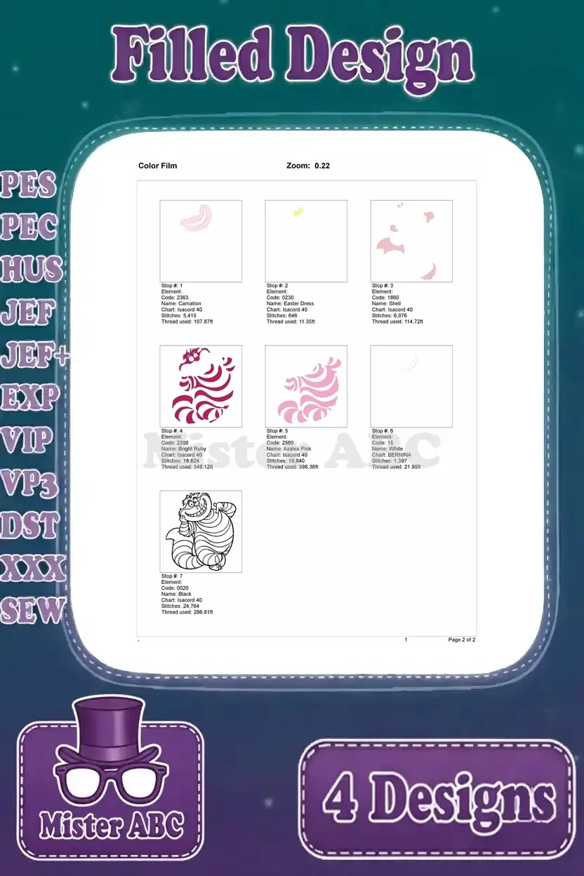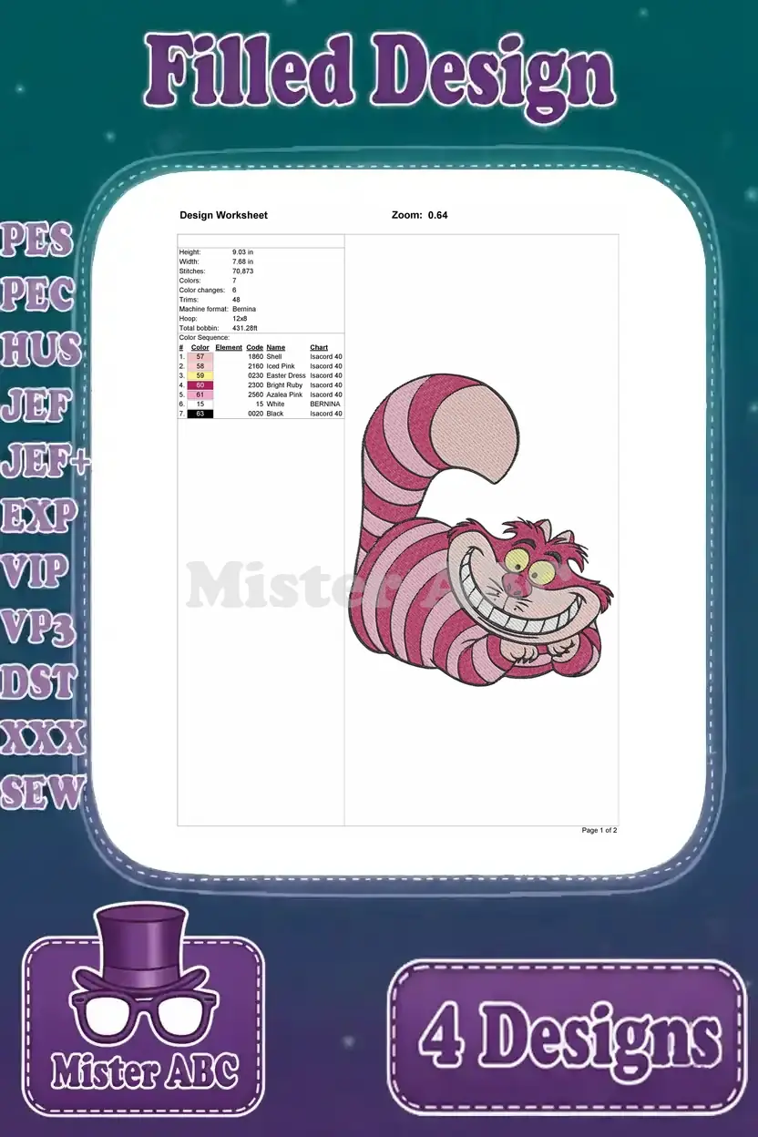 Unleash the mischievous grin with this vibrant Cheshire Cat embroidery bundle! Four unique, filled designs for all machines.