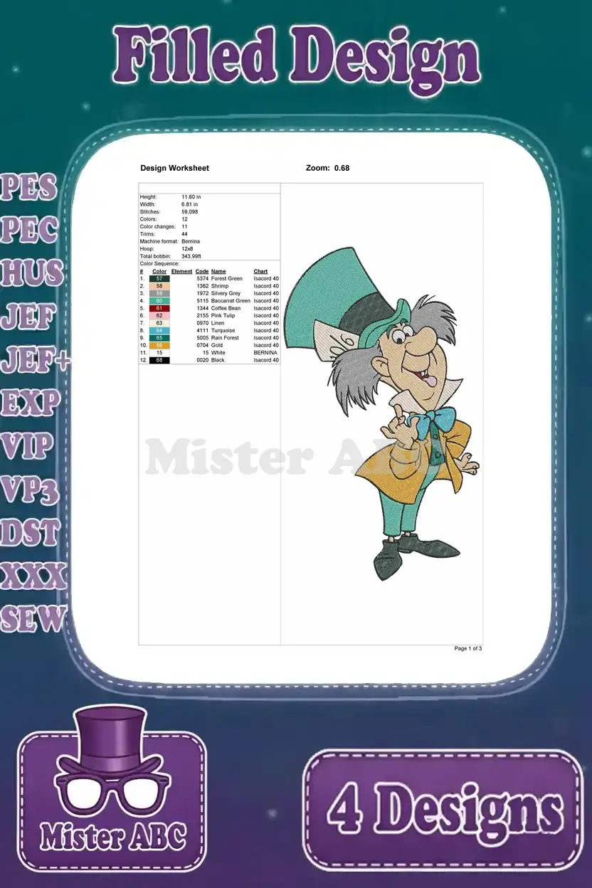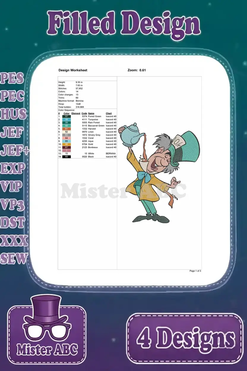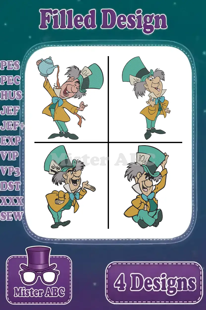 Alice In Wonderland Mad Hatter Various Eccentric Poses And Tea Py Character – Filled Embroidery Design