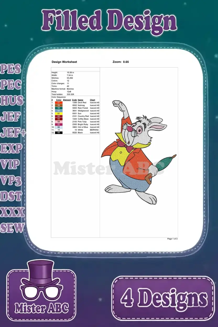 Alice In Wonderland White Rabbit Late For Important Date Various Running Poses – Filled Embroidery Design