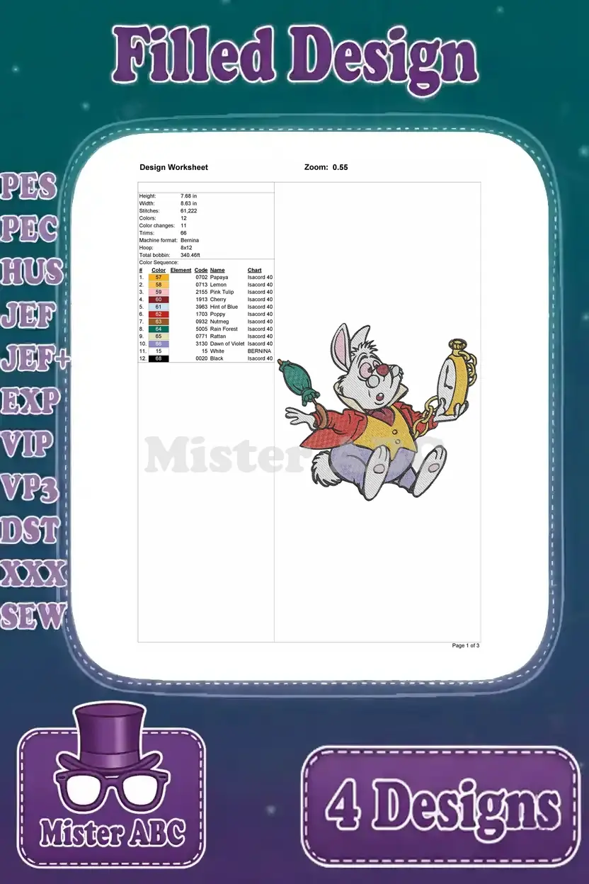 Delightful White Rabbit filled embroidery bundle featuring four whimsical poses from Alice in Wonderland. Perfect for enchanting projects!
