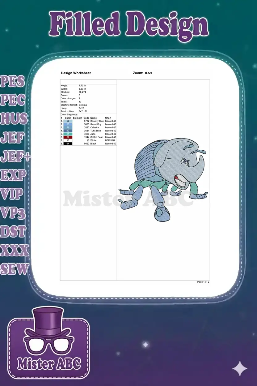 Angry blue rhino beetle insect cartoon embroidery designs