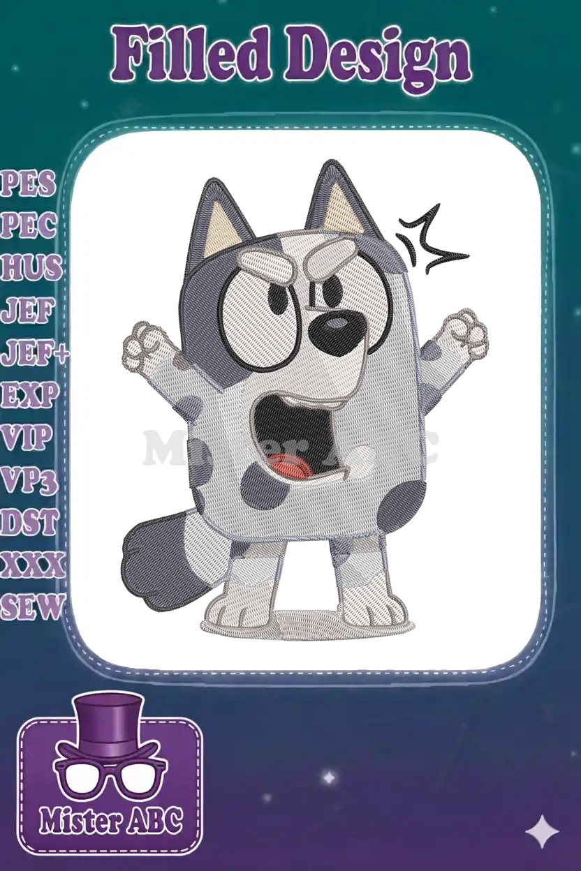 Angry Muffin Heeler yelling cartoon character embroidery designs