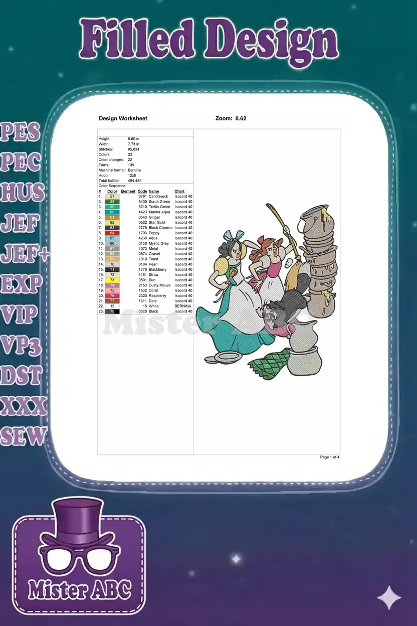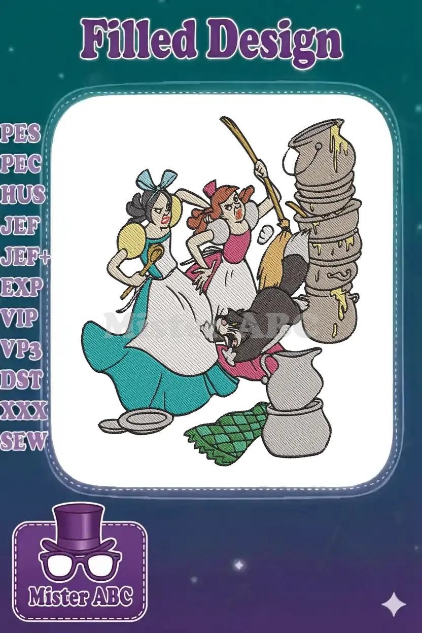 Angry stepsisters fighting cat with broom and dirty pots embroidery designs