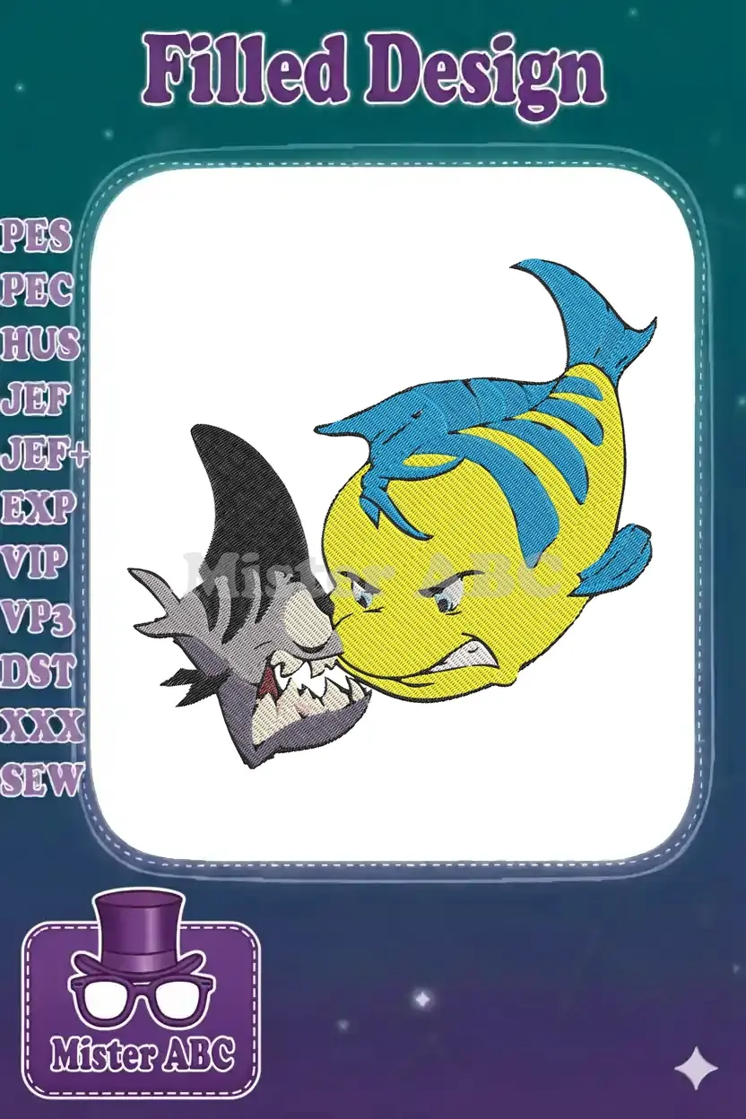 Angry yellow fish fighting aggressive grey shark embroidery designs