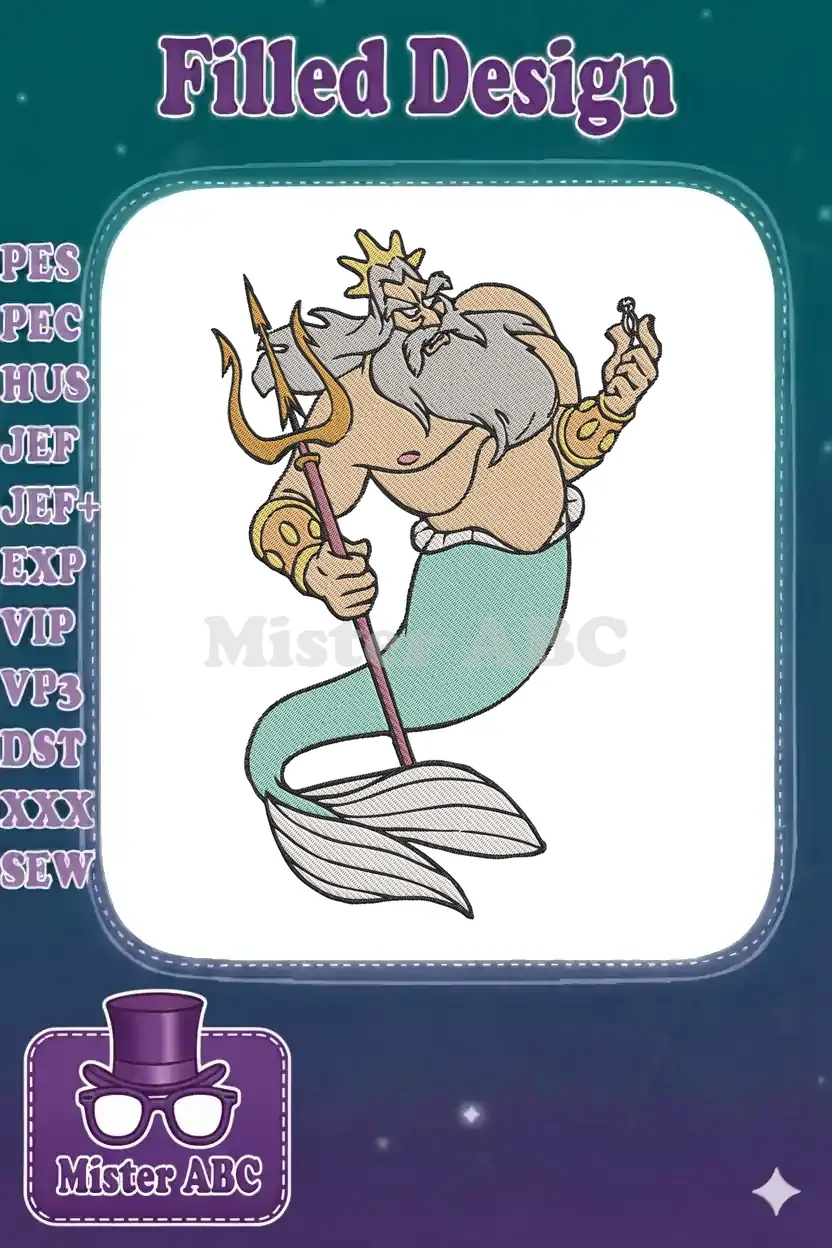 Animated King Triton Merman with Trident and Ring Embroidery Designs