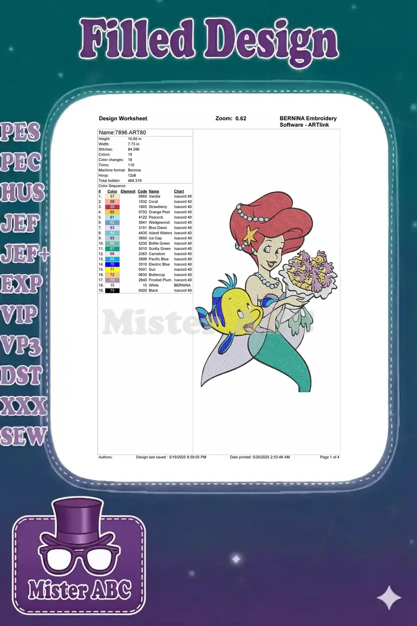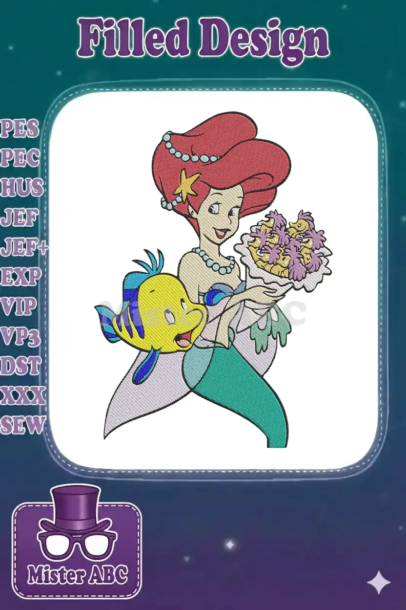 Capture the magic of the deep sea with this delightful Ariel and Flounder embroidery design, perfect for Disney fans.
