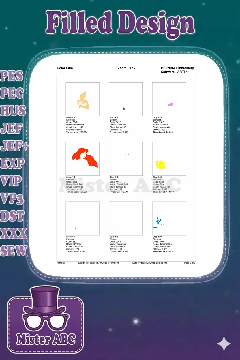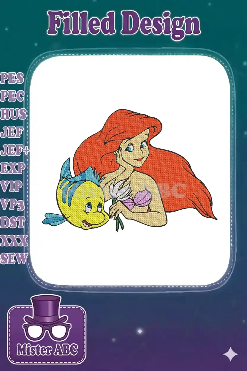 Dive into a magical underwater world with this enchanting Ariel and Flounder embroidery design. Perfect for Disney fans!