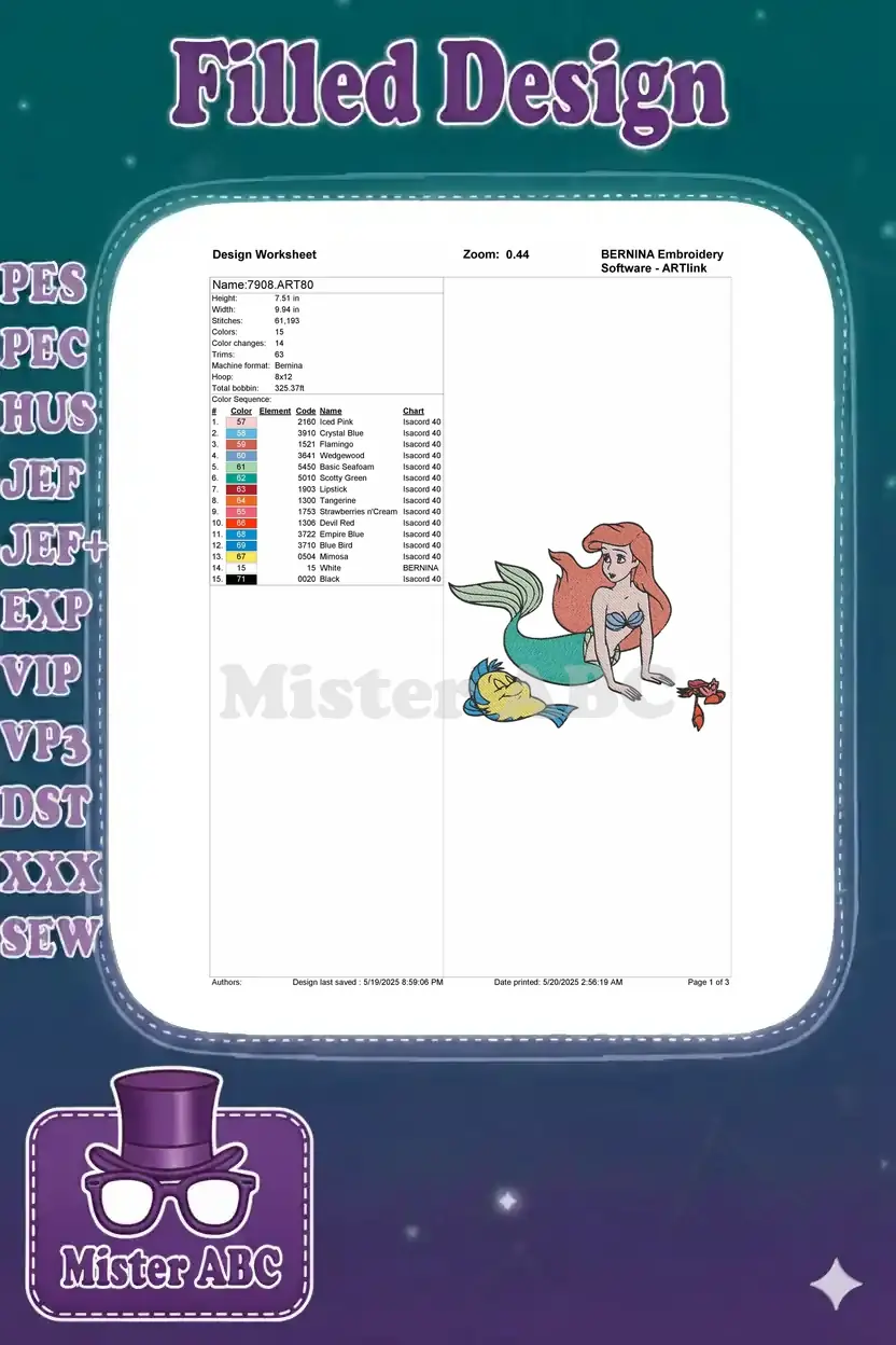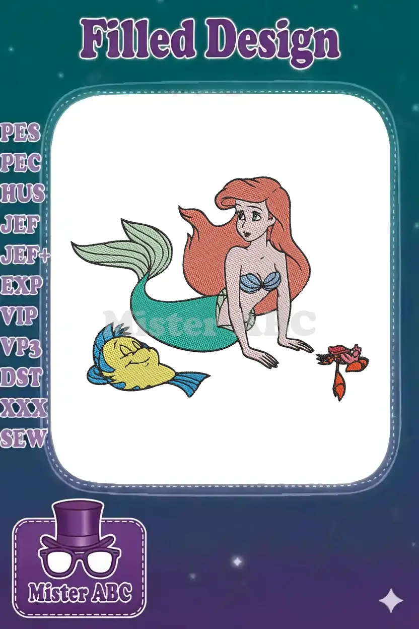 Ariel Flounder Sebastian Little Mermaid Cartoon Embroidery Designs