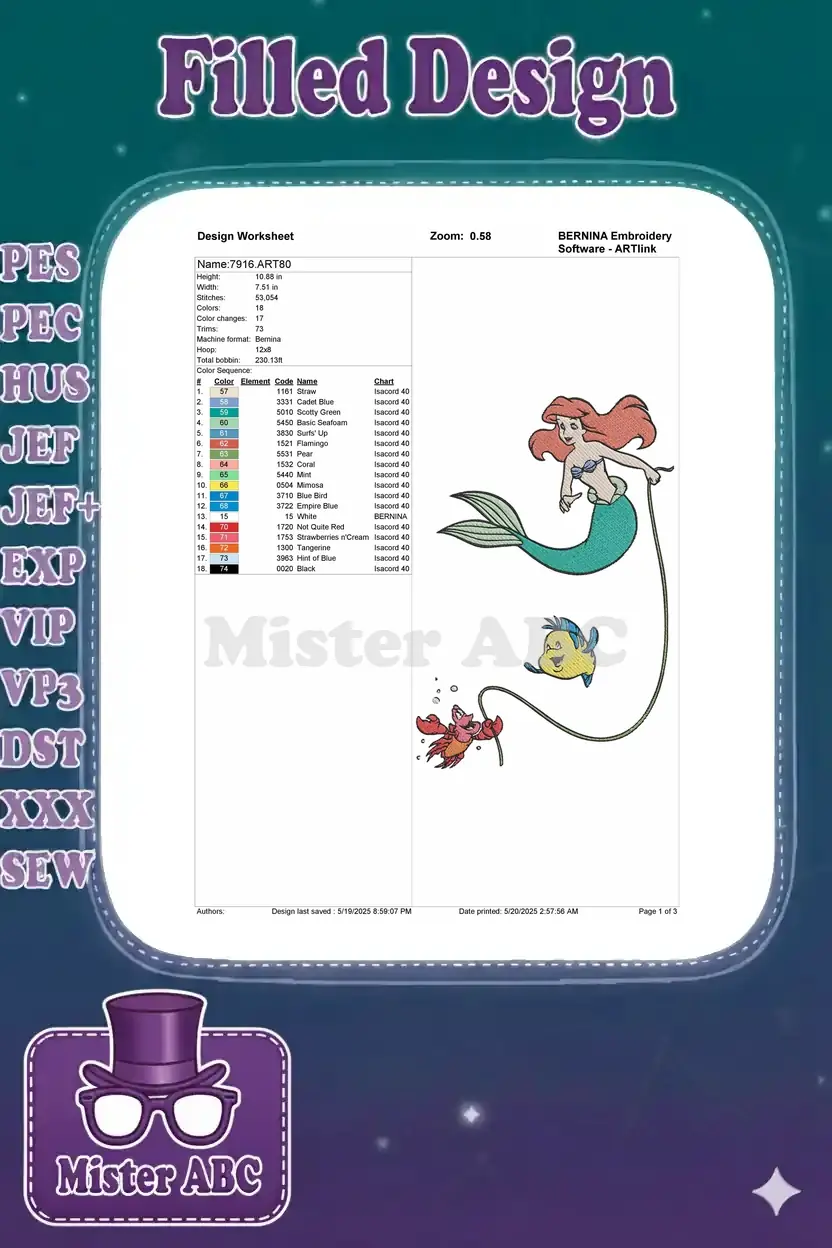 Ariel Flounder Sebastian under sea adventure embroidery designs