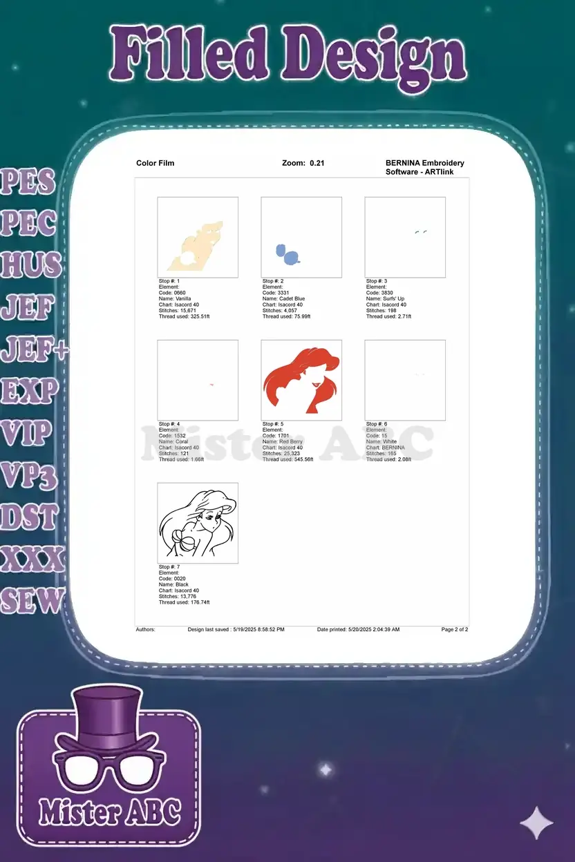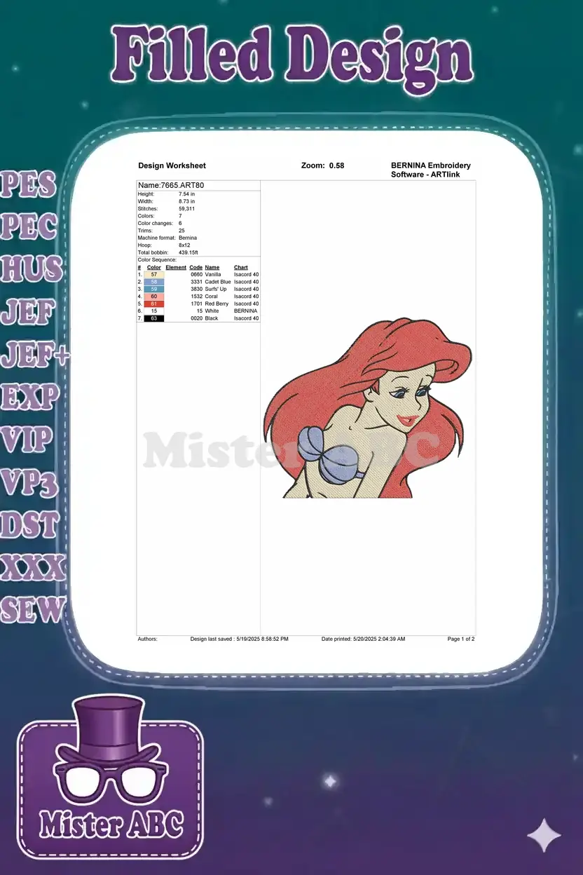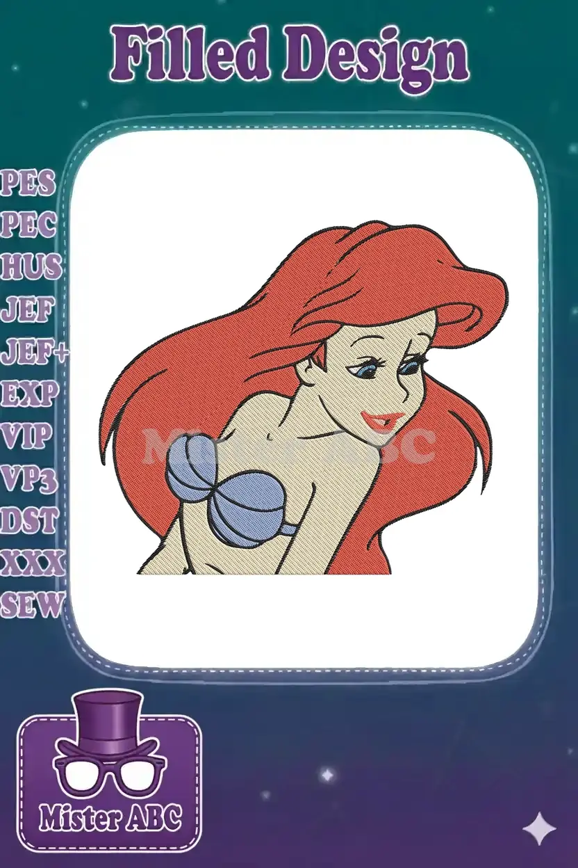 Dive into enchantment with this vibrant Ariel embroidery design, perfect for adding a touch of Disney magic to any project. A charming, high-quality digital stitch.