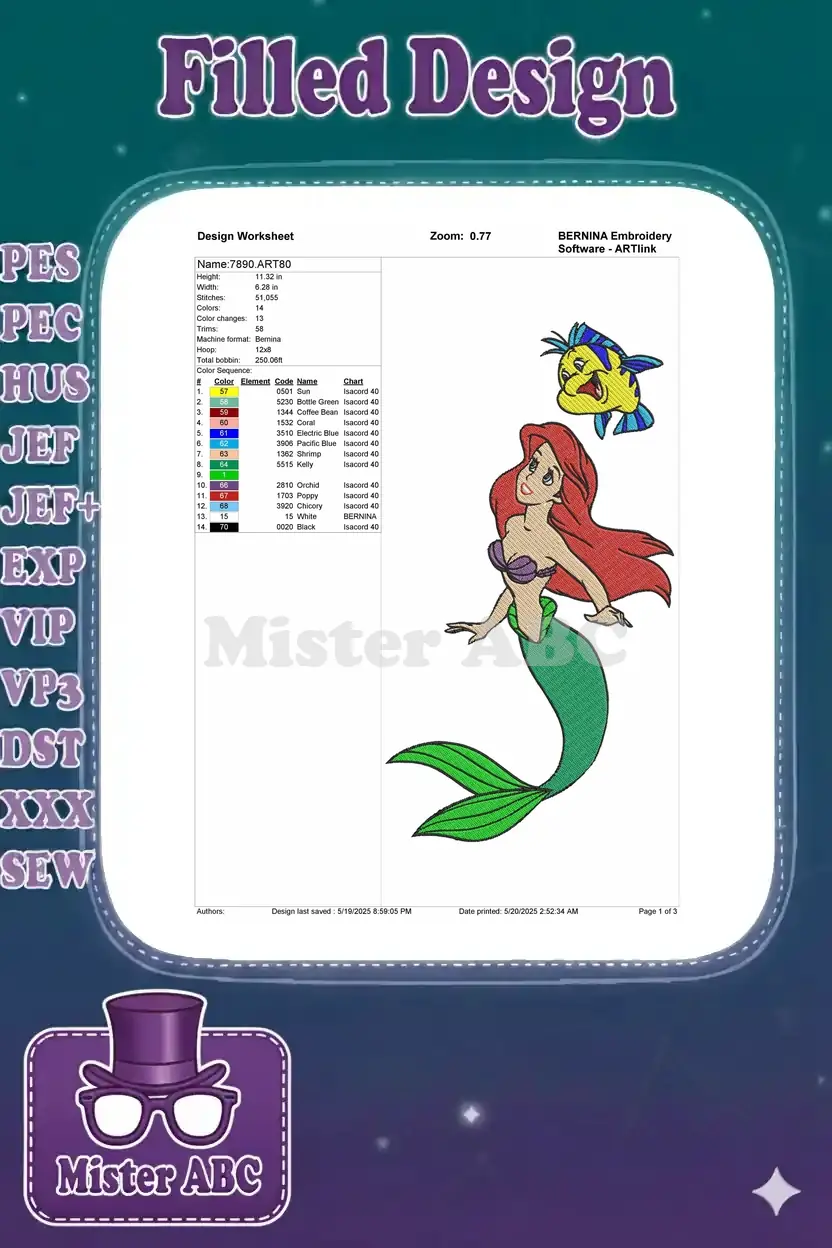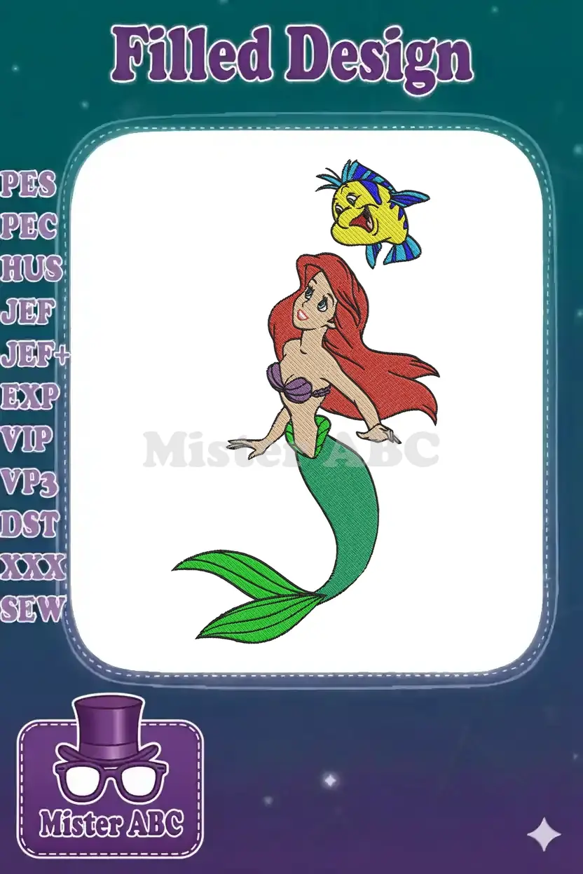 Ariel Little Mermaid and Flounder fish embroidery designs