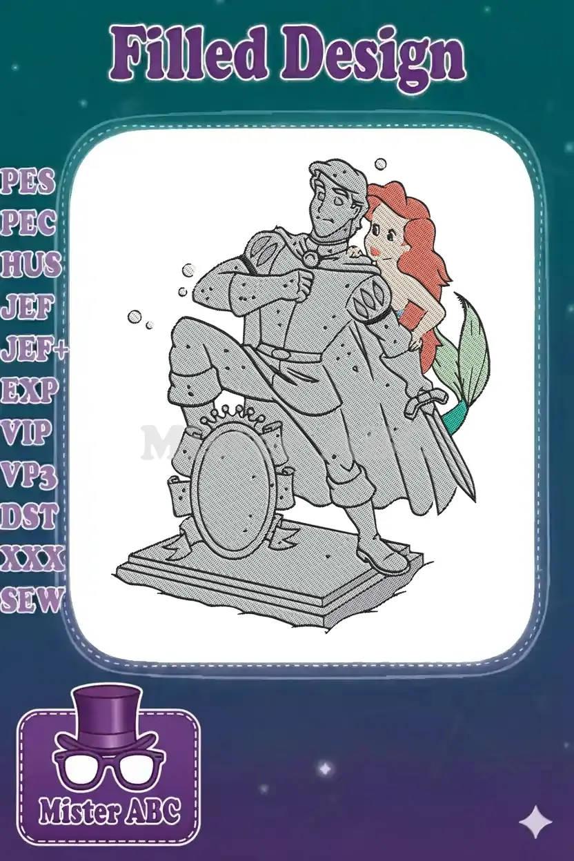 Ariel Little Mermaid with Prince Eric statue underwater embroidery designs